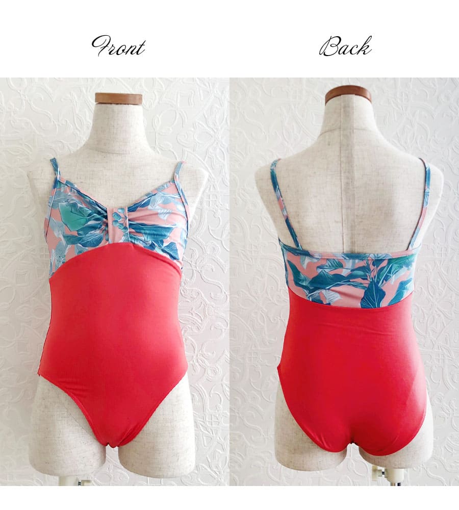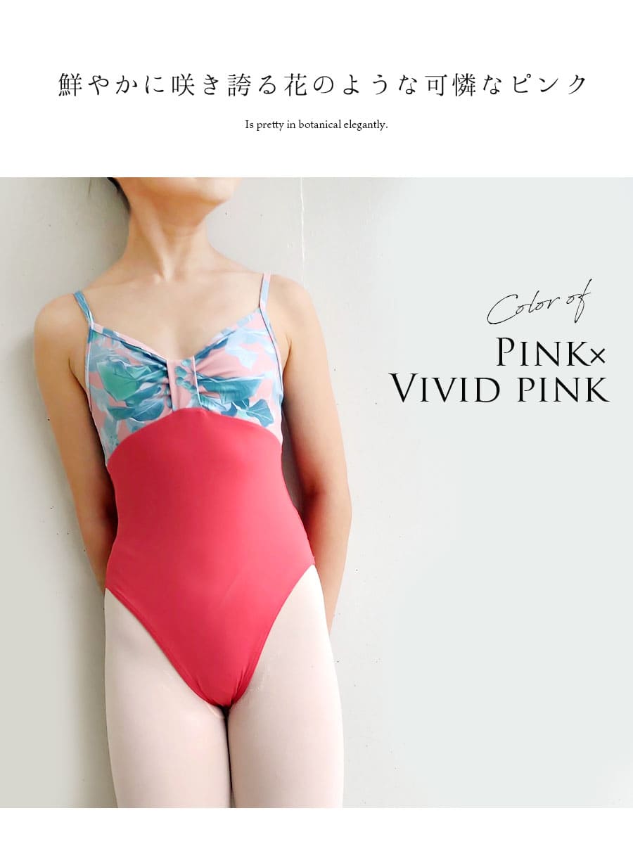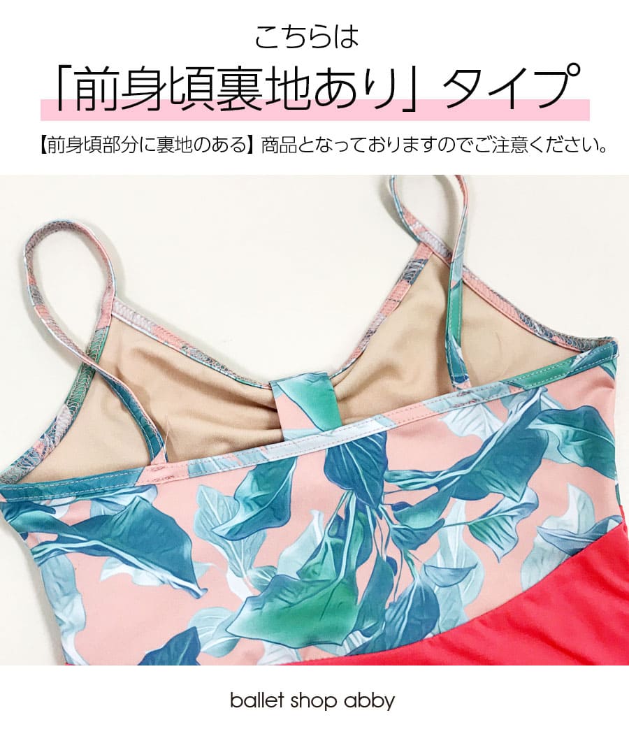 ヴィヴィッドなカラーが目を惹く、伸びが良くて、しなやかで、シルエットがキレイ…上品で可憐なボタニカル生地で華やかさを出した、アビーオリジナルデザインのキッズ&ジュニアレオタード。M・L・XLサイズ展開。こちらは【前身頃裏地付き】タイプです。