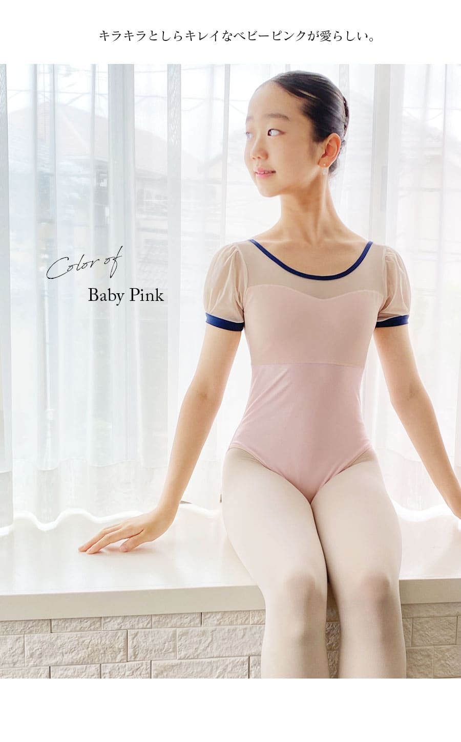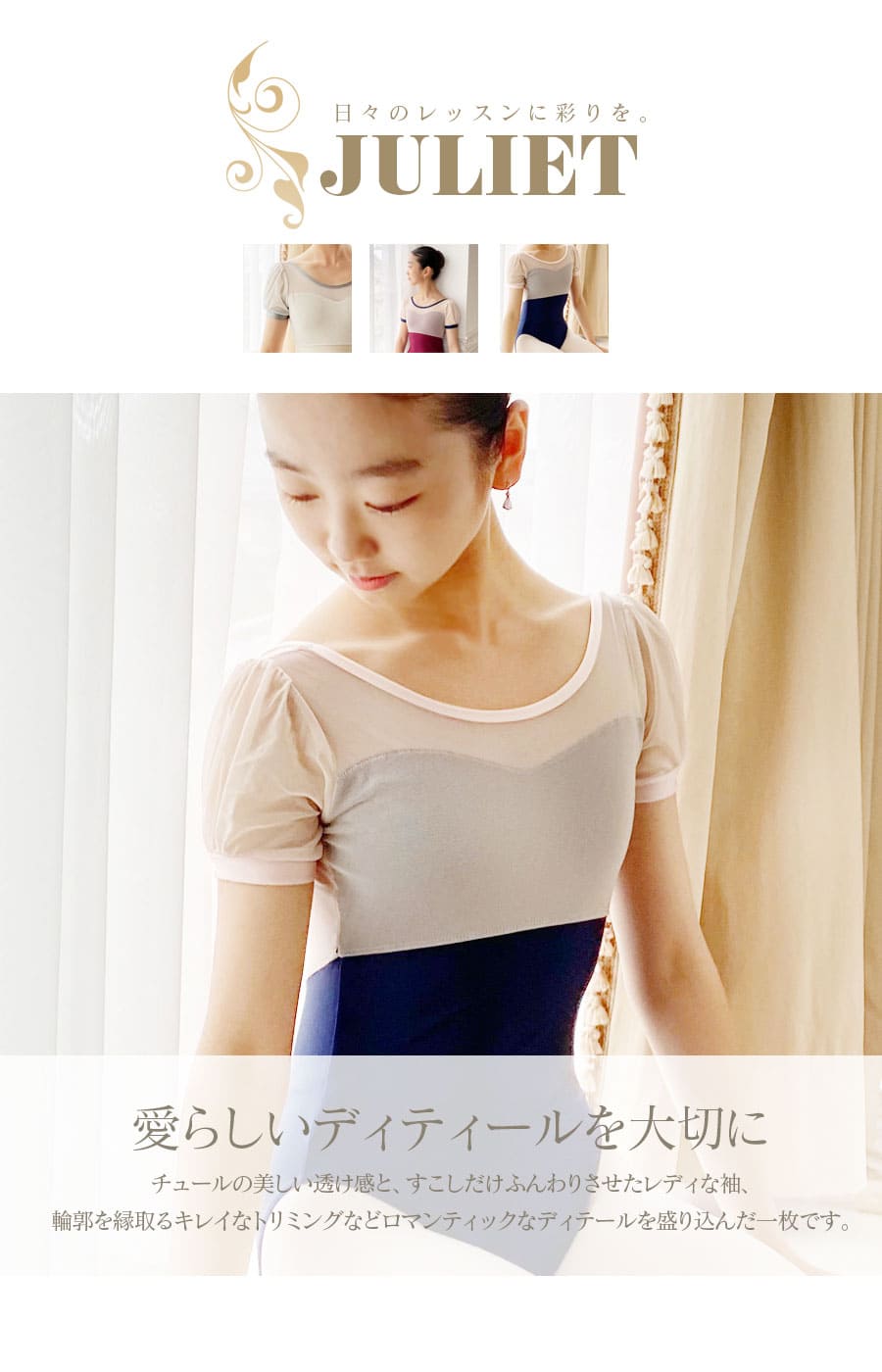毎日のレッスンに彩りを。 洗練されたカラーのトリミング、すこしふんわりしたパフィなチュール袖がロマンティックなレオタードです。 胸元のビスチェ風のカッティングも可愛らしく、少しシャイニーな高級感あるストレッチ素材、厳選したボディカラーも素敵に仕上がりました。 伸びの良いしなやかな素材だから、身体に馴染むようにすっとフィット。動きを妨げません。