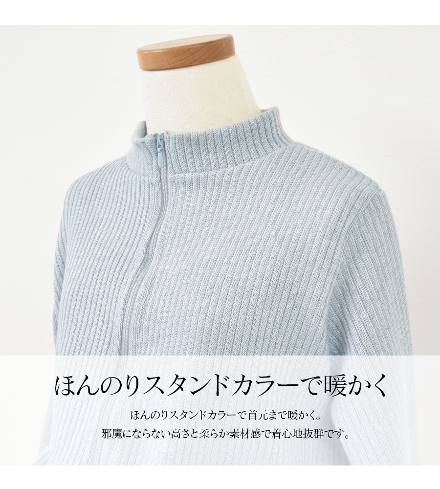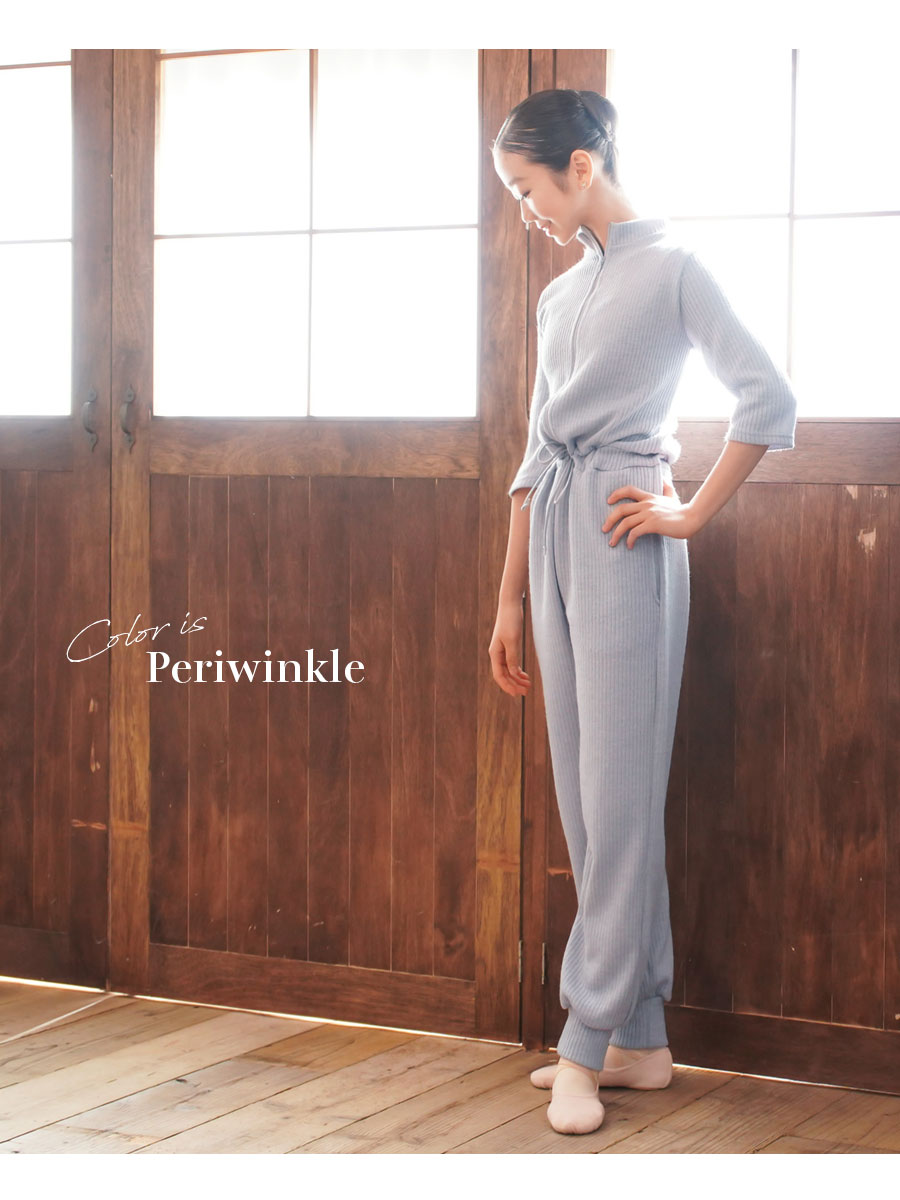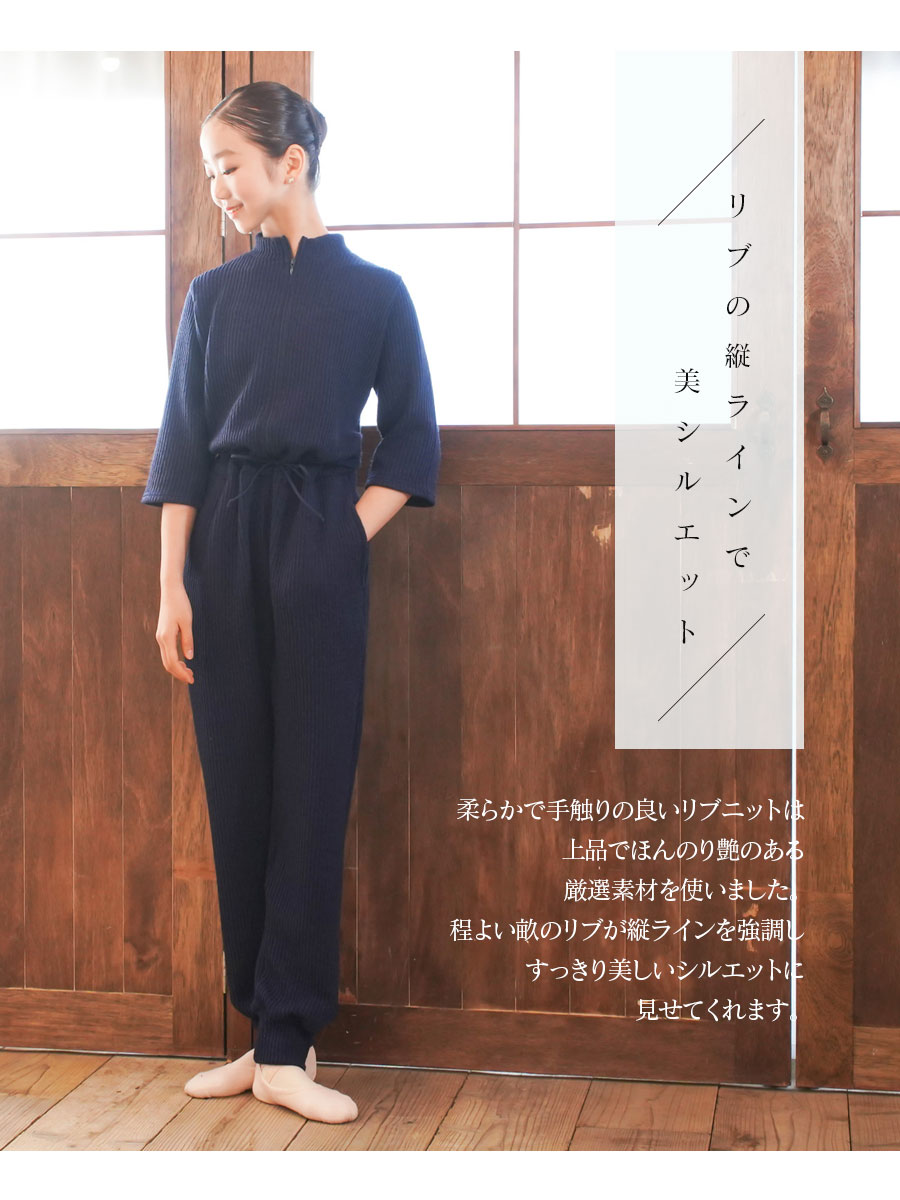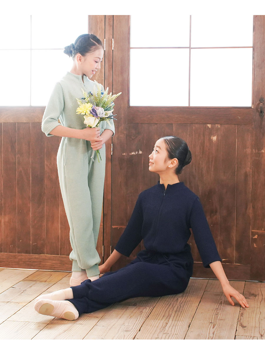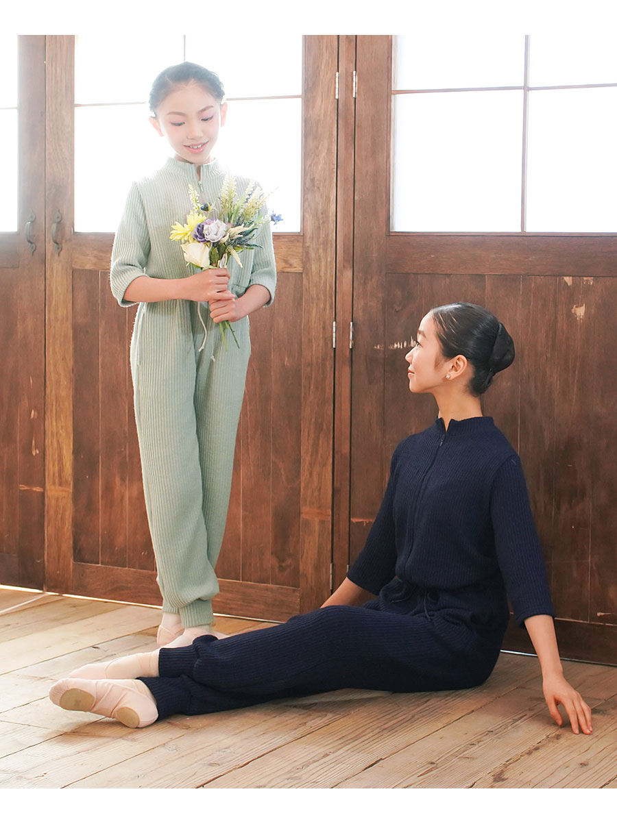 厳選したリブニットはふんわり暖かく、邪魔にならない高さのスタンドカラーデザインで首元も暖か。レッスン中やウォームアップ後も身体を冷やしません。
