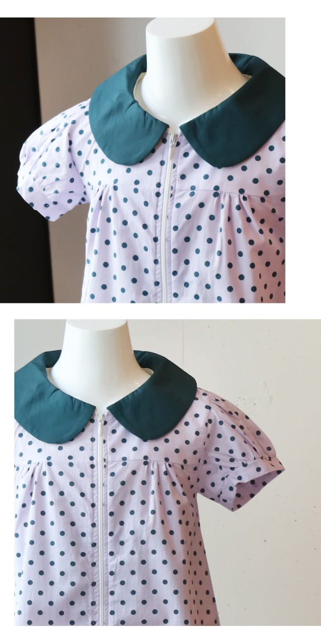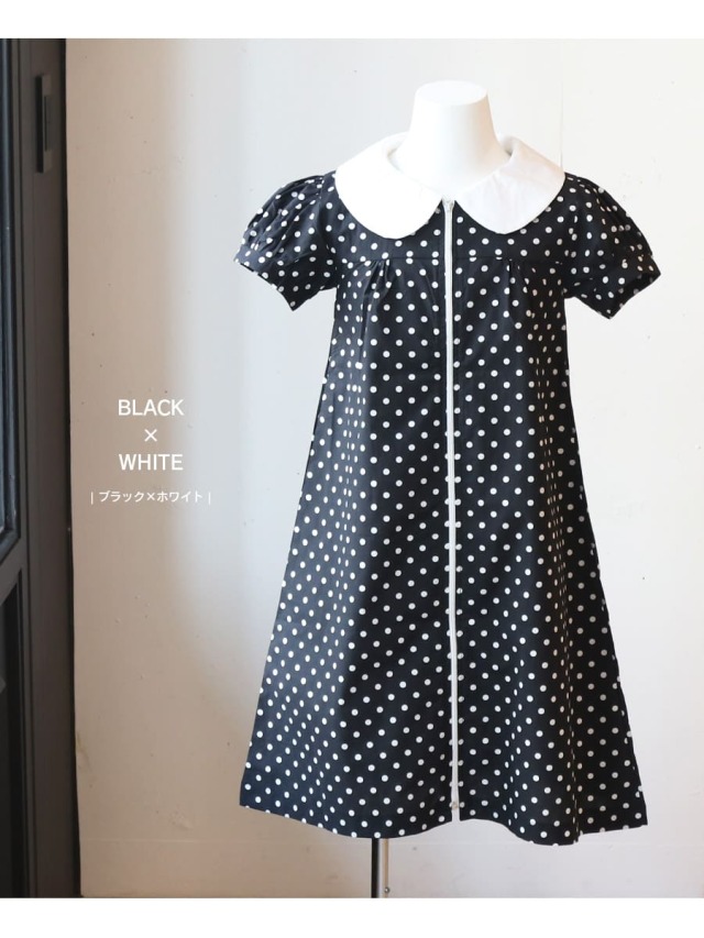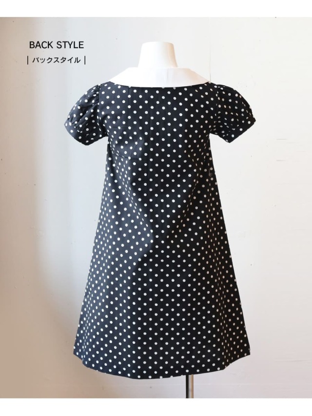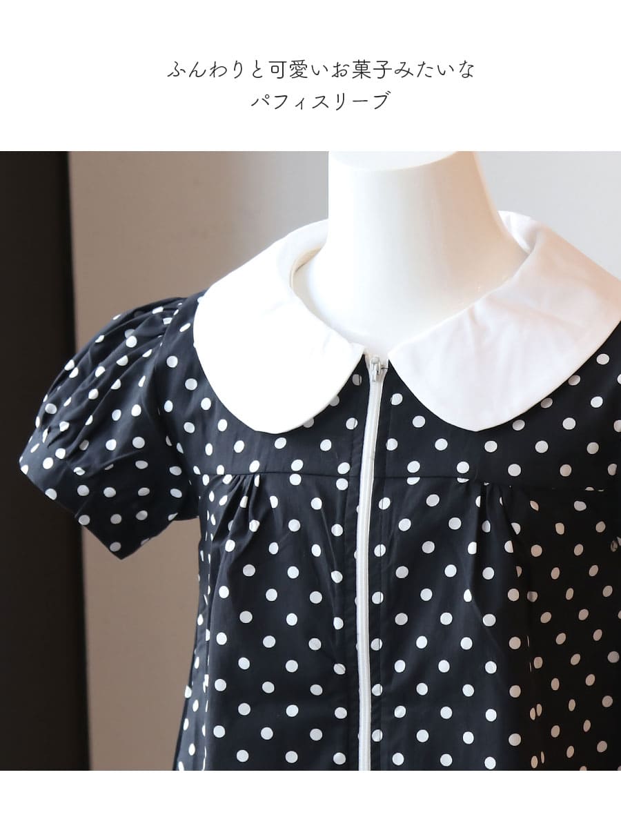 どこかレトロなドットのボディにふんわりパフィーなパフ袖&丸襟で愛らしいデザインに。