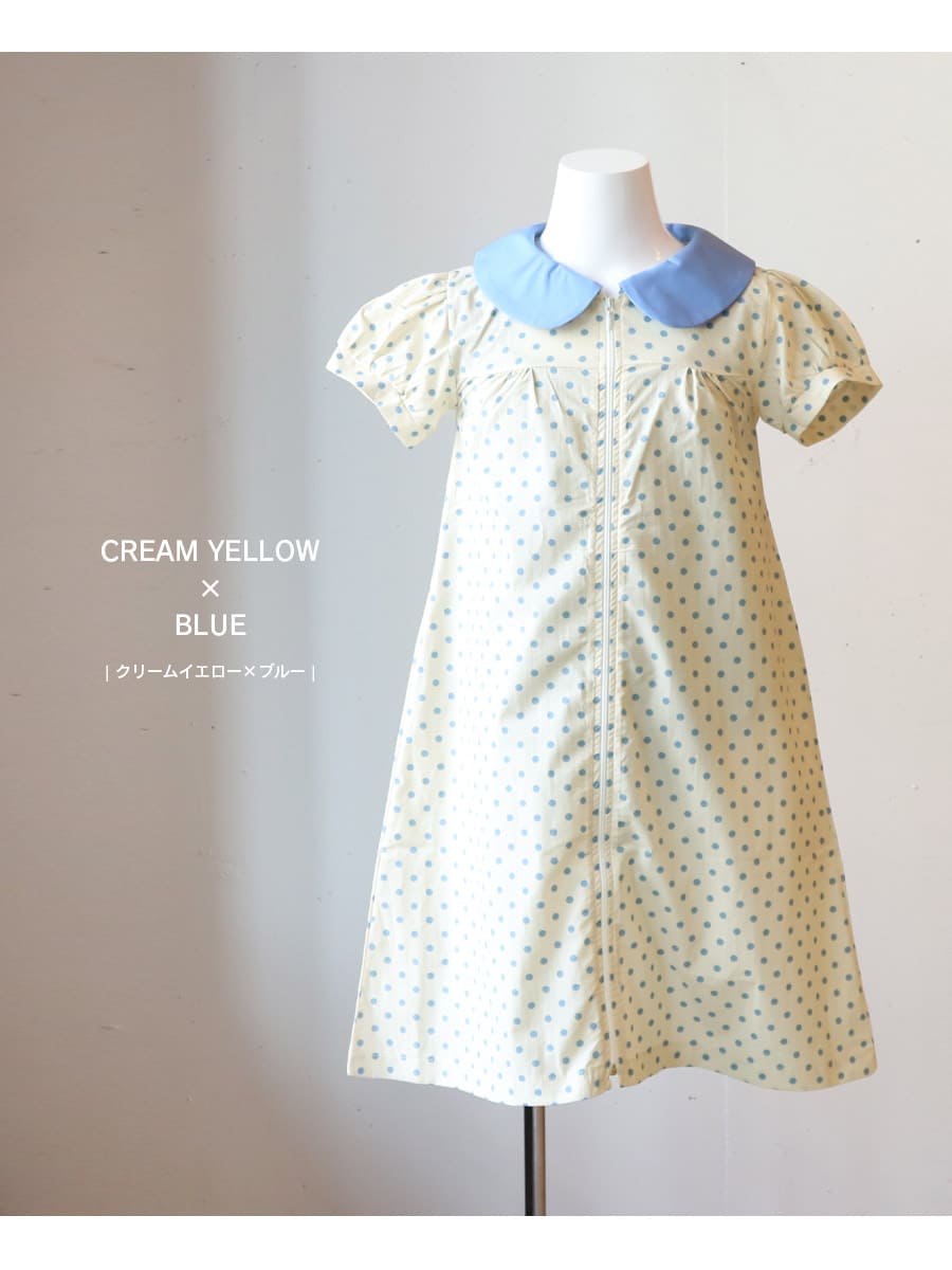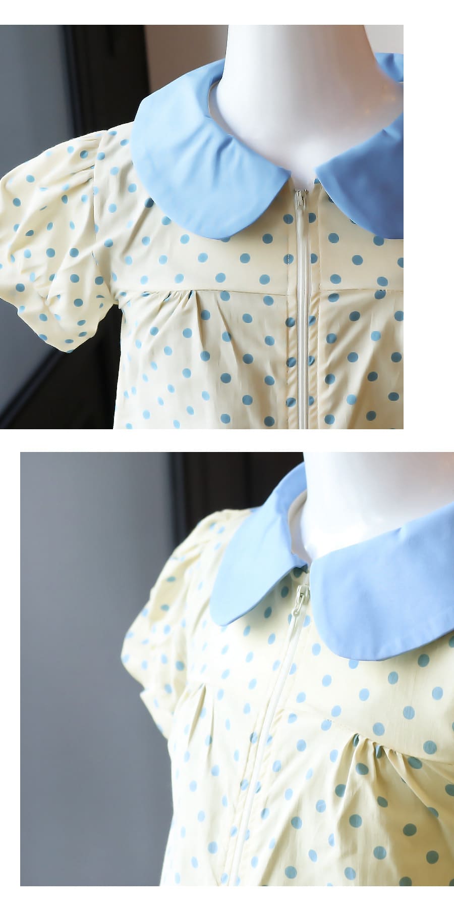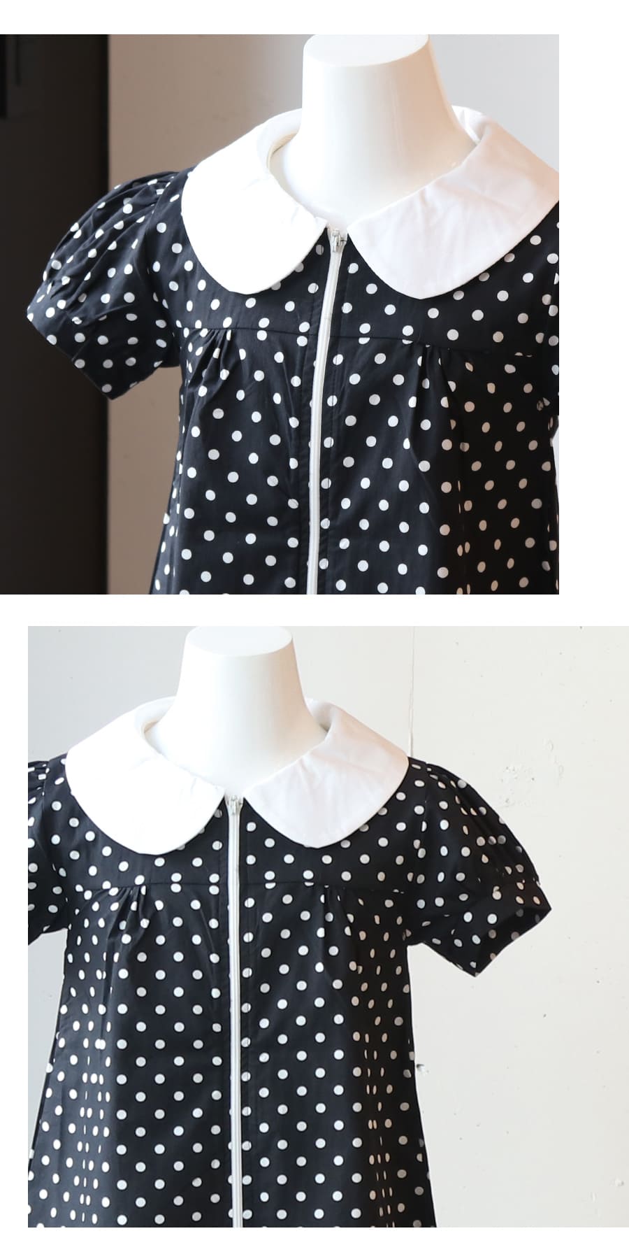 どこかレトロなドットのボディにふんわりパフィーなパフ袖&丸襟で愛らしいデザインに。