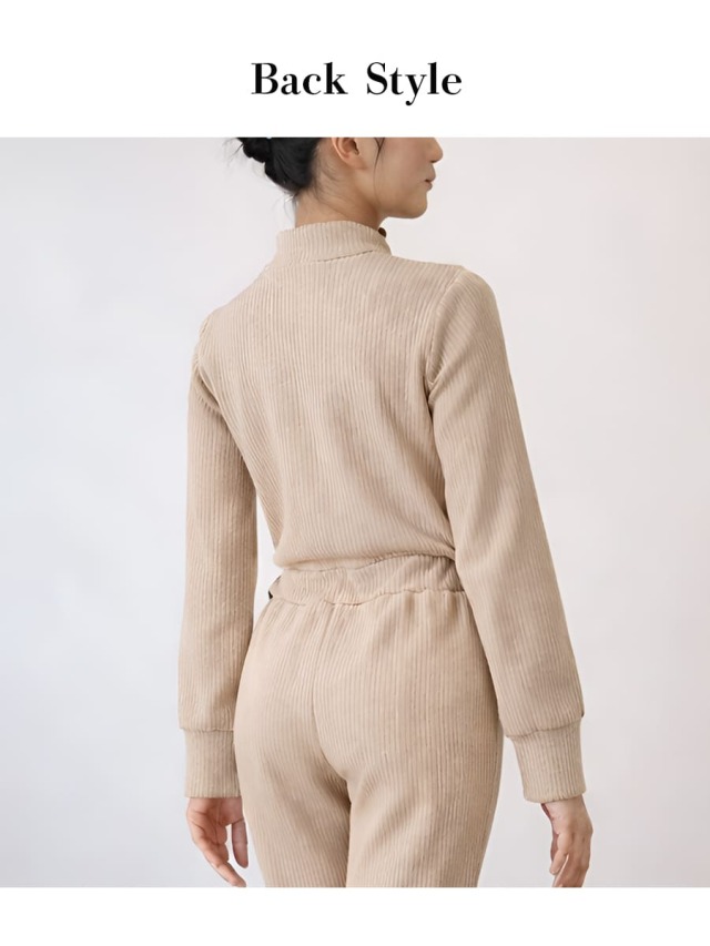 リブ編みの縦ラインが脚をすらりと見せ、ウエストのドローストリングがシルエットを上品に。