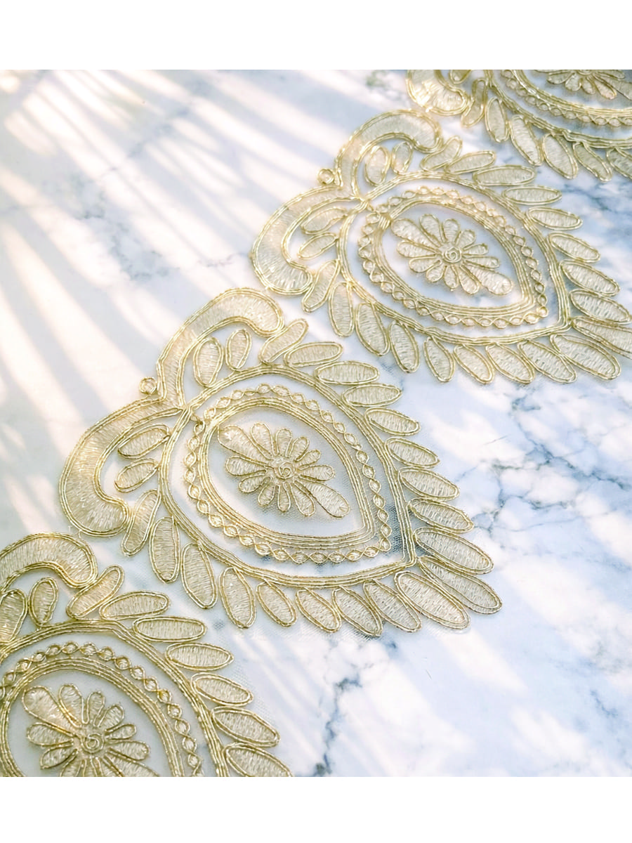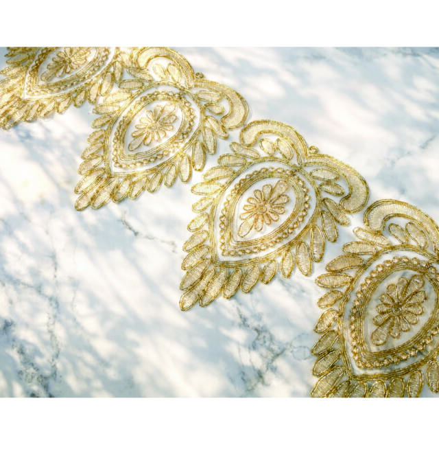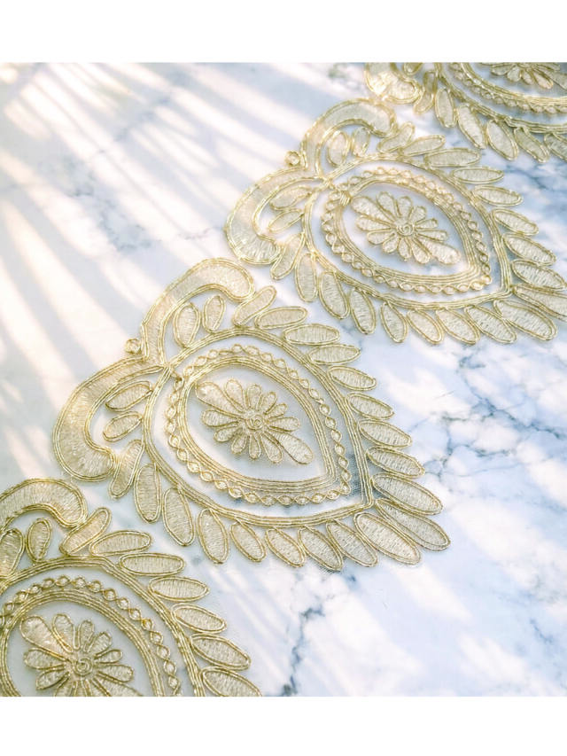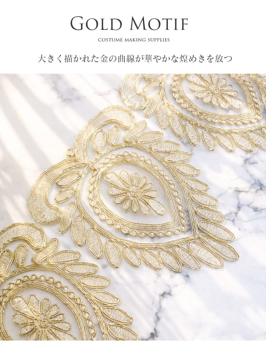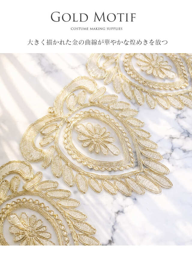 大きく描かれた金の曲線が華やかな煌めきを放つゴールドモチーフレース。