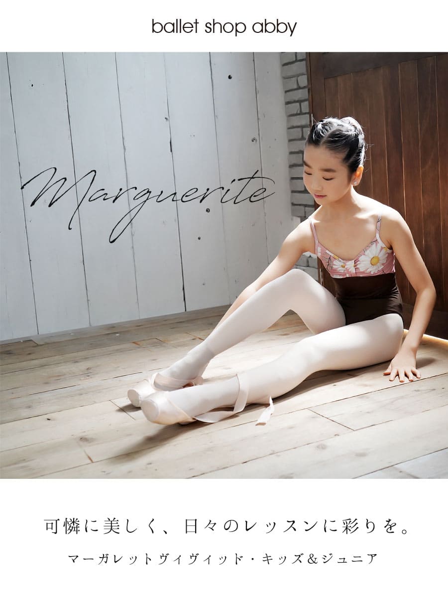 毎日のレッスンに彩りを。日々のレッスンがもっと楽しくなる、上品で愛らしいマーガレット柄素材を使ったキッズ・ジュニアレオタードです。すでに発売中、大好評の「マーガレット」により鮮やかな彩りをプラスした「マーガレット・ヴィヴィッドバージョン」。伸びが良くて、しなやかで、シルエットがキレイ…アビーオリジナルデザインのキッズレオタードは、胸元のリボンデザインと、大胆なのに上品なグラフィックとカラー使いの生地を使い、派手さを抑えながら品の良い上品なイメージに仕上げた一枚です。シンプルかつ定番デザイン、もちろんレッスンの動きを妨げない細部まで調整したデザインと、伸びが良く、優しい肌触りの素材で仕上げました。裏地ありタイプ、脚長効果の高いハイレグタイプです。サイズもキッズからジュニアサイズまで揃えました。
