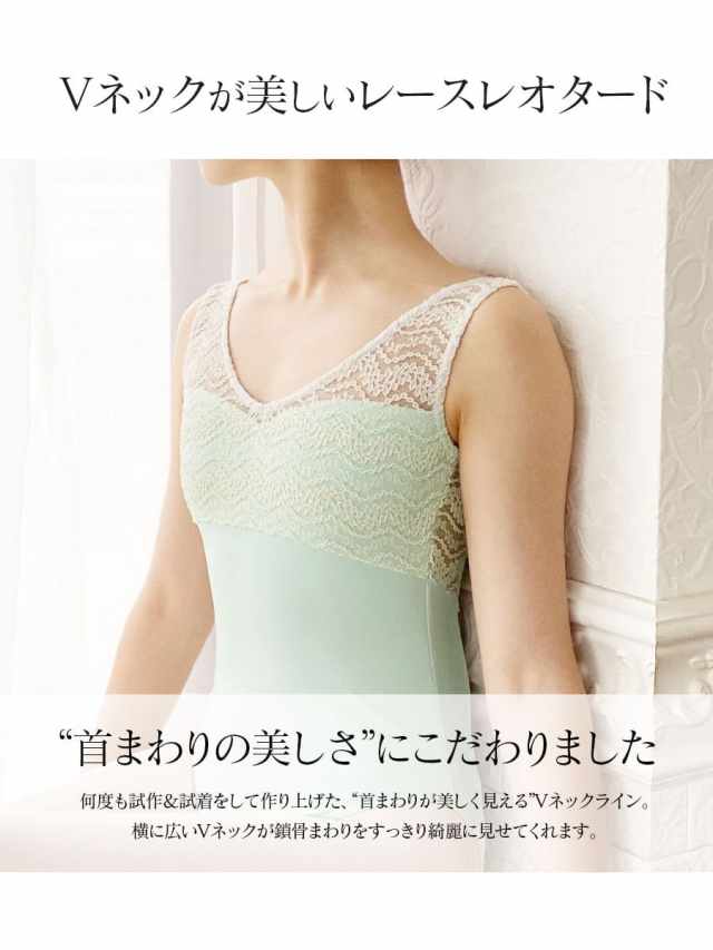 首まわりがすっきり美しく見える、試作&試着を繰り返して作ったこだわりのVネックがポイント! たくさんのレースの中から厳選した、ストレッチレースが美しいオリジナルレオタードです。