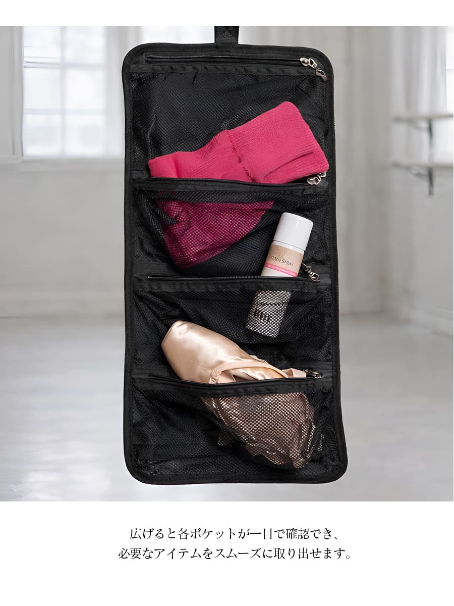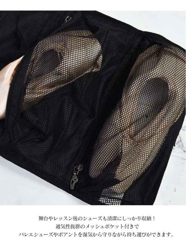 収納は、ヘアアクセサリーやメイク小物に便利な中サイズポケット3つと、トウシューズ1足も収納できる大容量ポケットを装備。