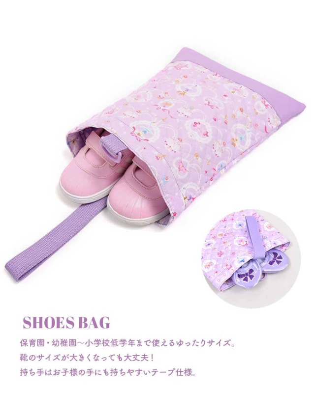 小学校・幼稚園・保育園の机のフックに掛けても底につかない便利なループ付き。 小学校・幼稚園・保育園からの一般的な指定サイズ30×40cmで、大判絵本やスケッチブックも入ります。持ち手はお子様の手にも持ちやすいテープ仕様。名札を付けるDカンも付属しています。