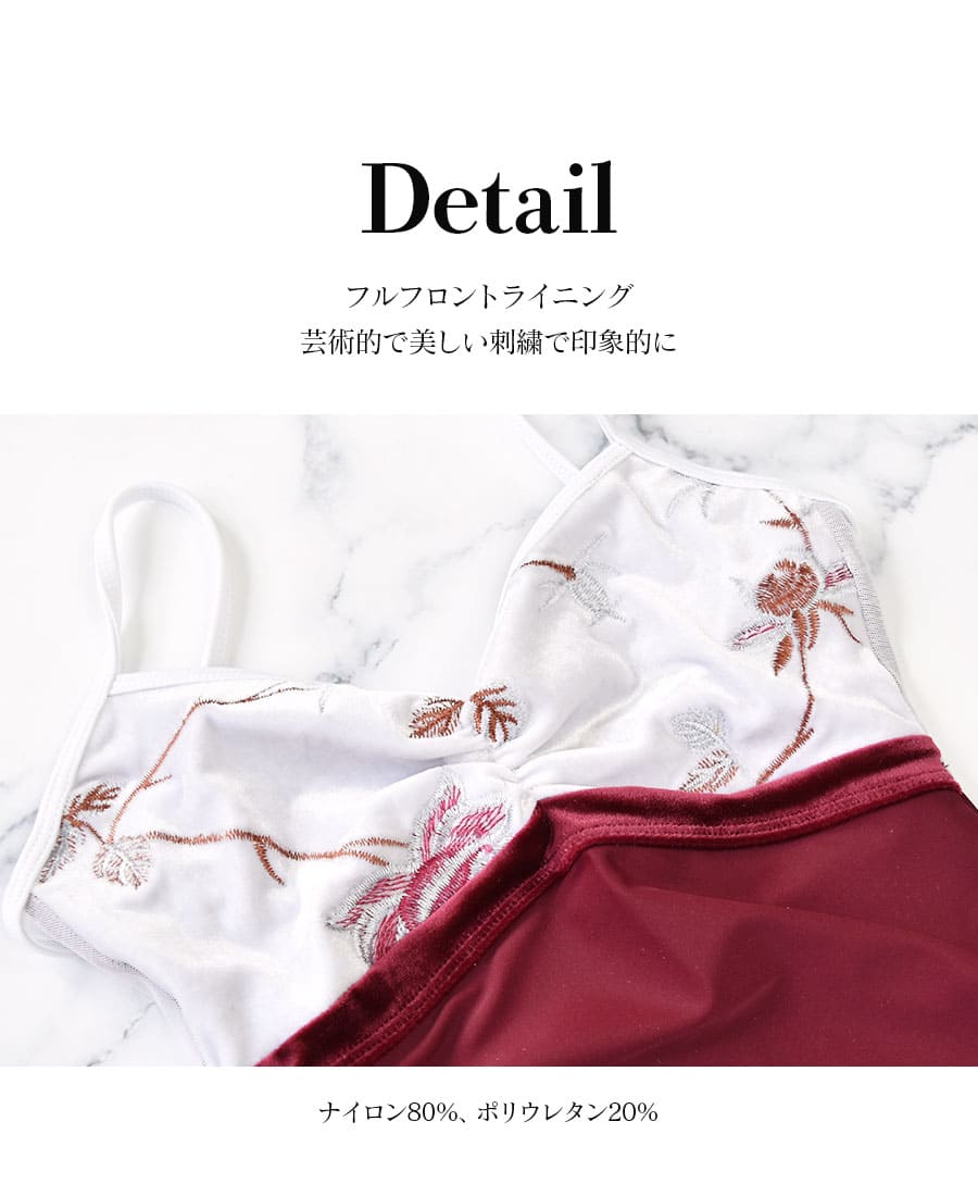 バスト部分は艶のあるベルベットで上品に。ストレッチの効いた花の刺繍レース生地が本当に美しいデザイン。