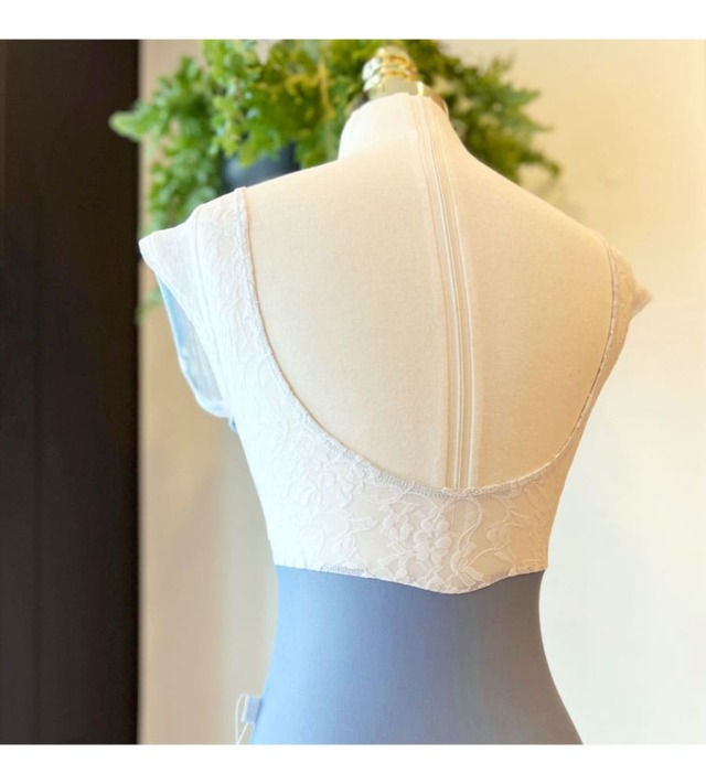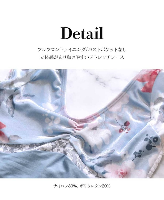 胸元に儚げな水彩タッチの花柄と背中のストレッチメッシュとのコントラストが楽しい一枚。