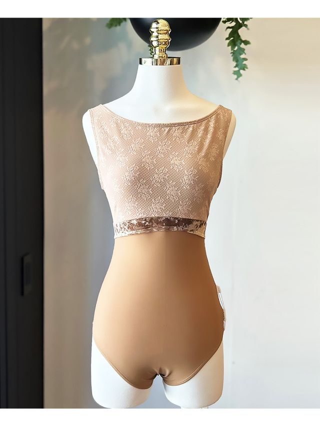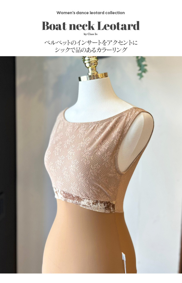 トップに豪華なレースをあしらったボートネックタイプレオタード。