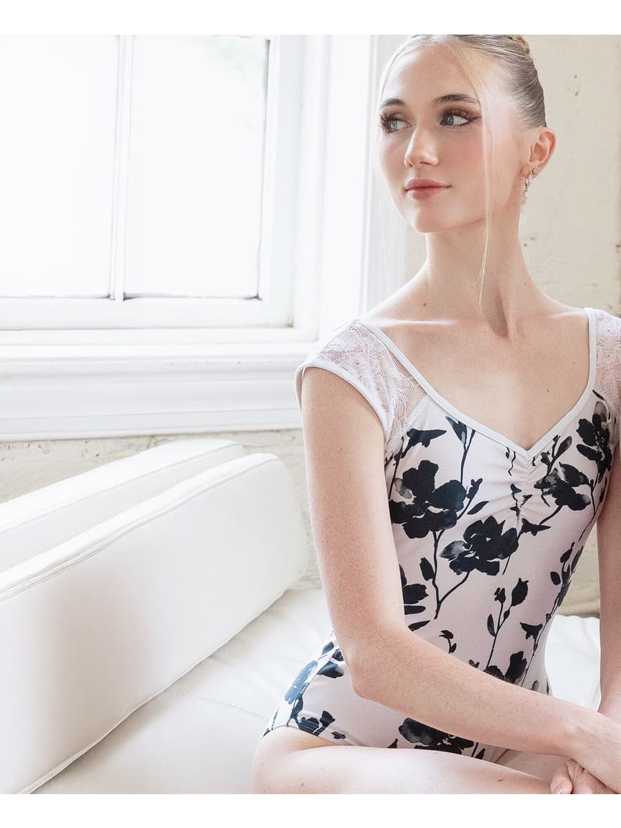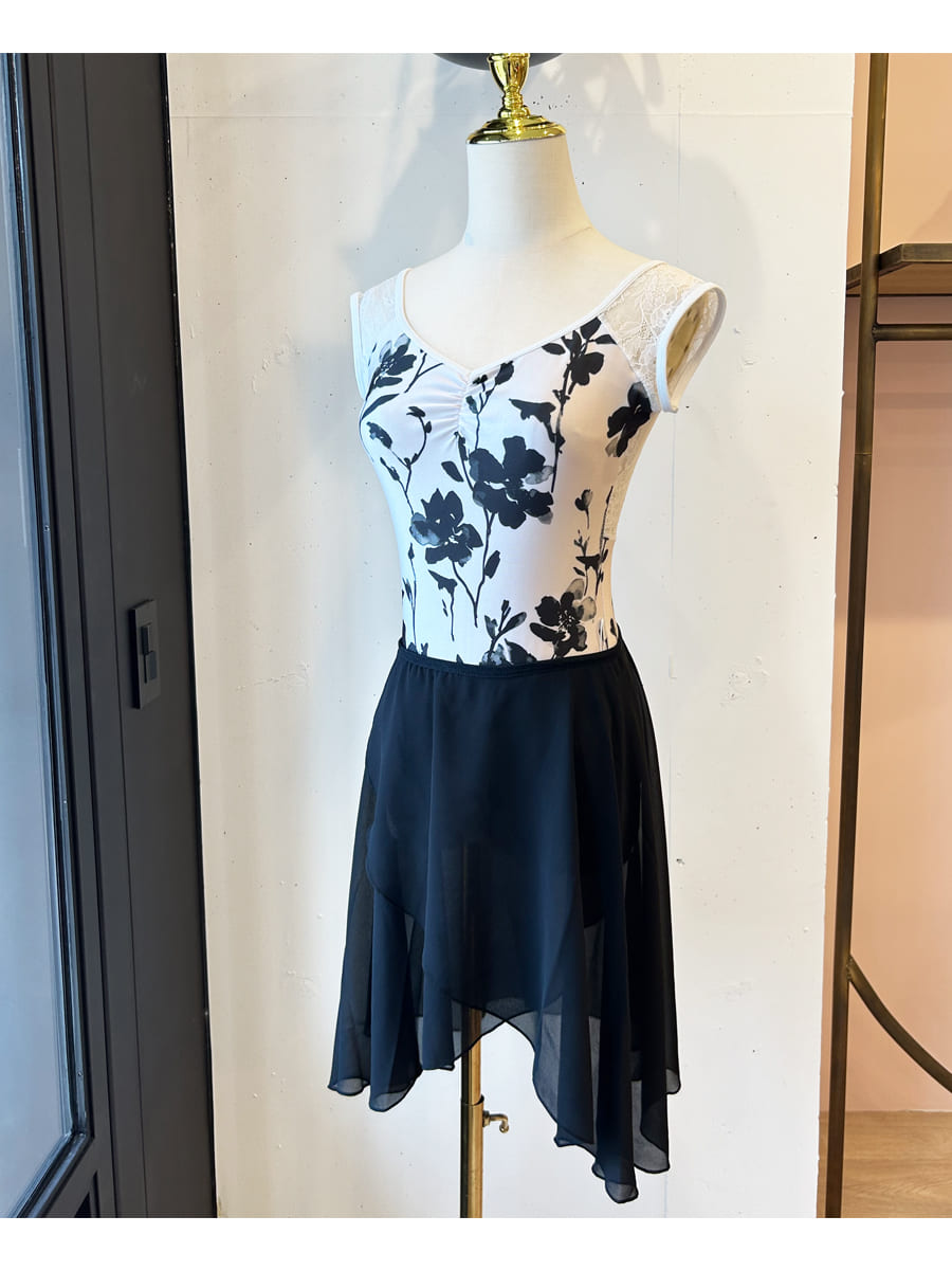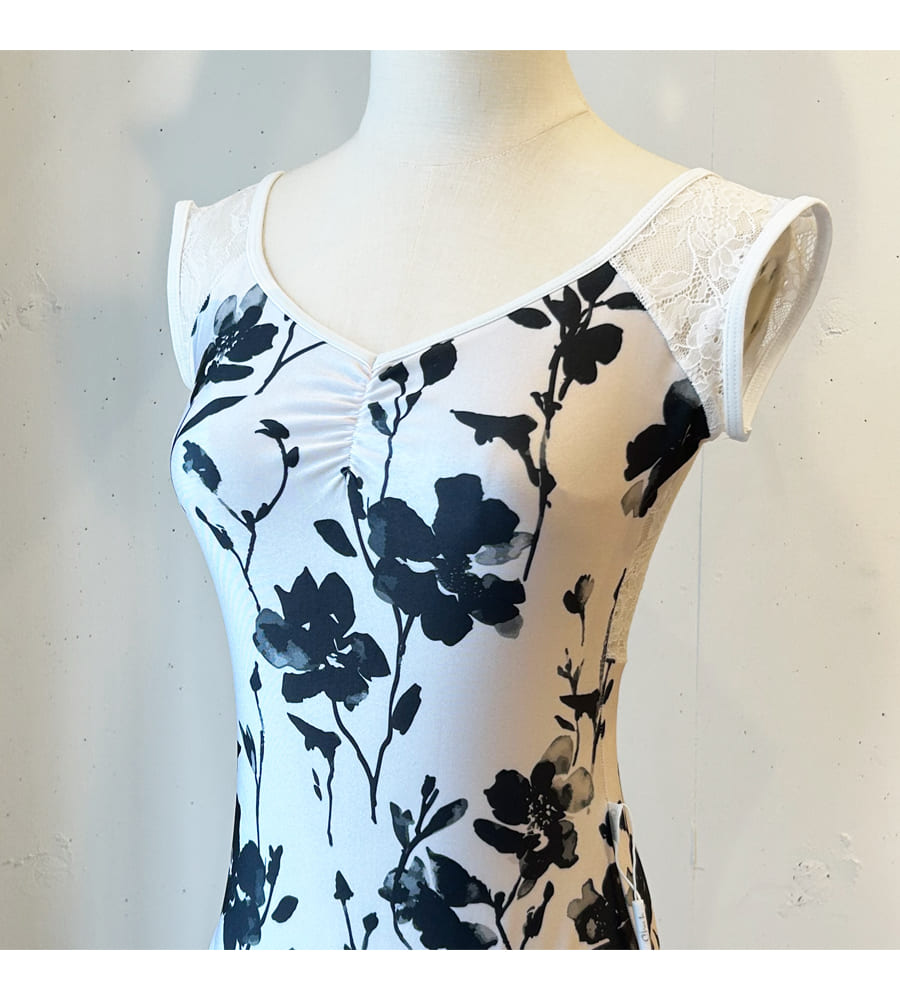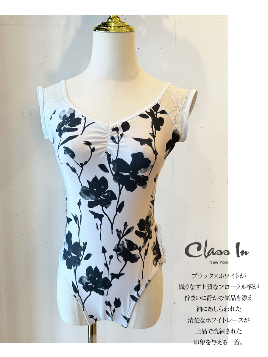 ブラック×ホワイトが織りなす上質なフローラル柄が、佇まいに静かな気品を添えるレオタード。