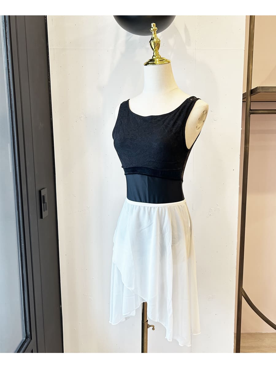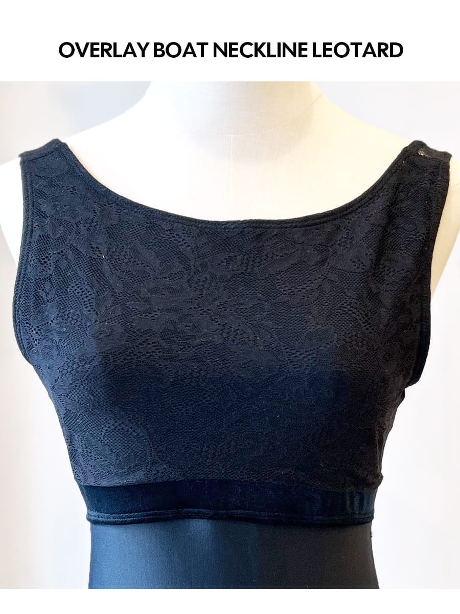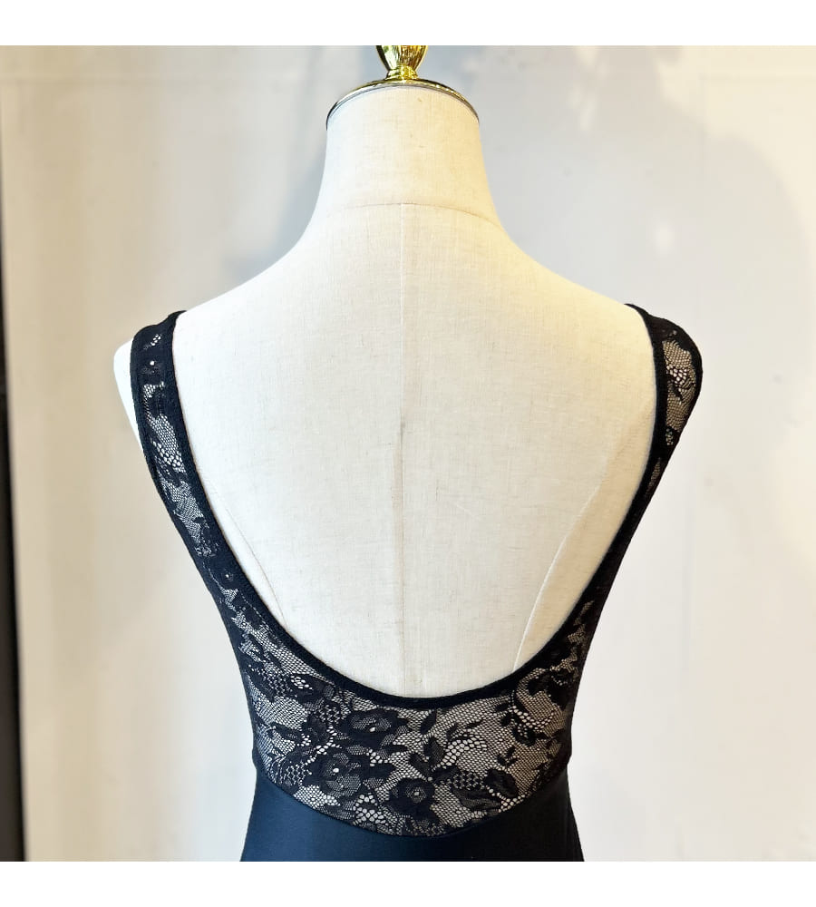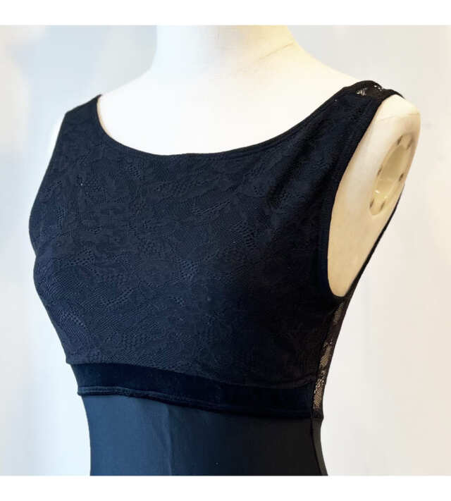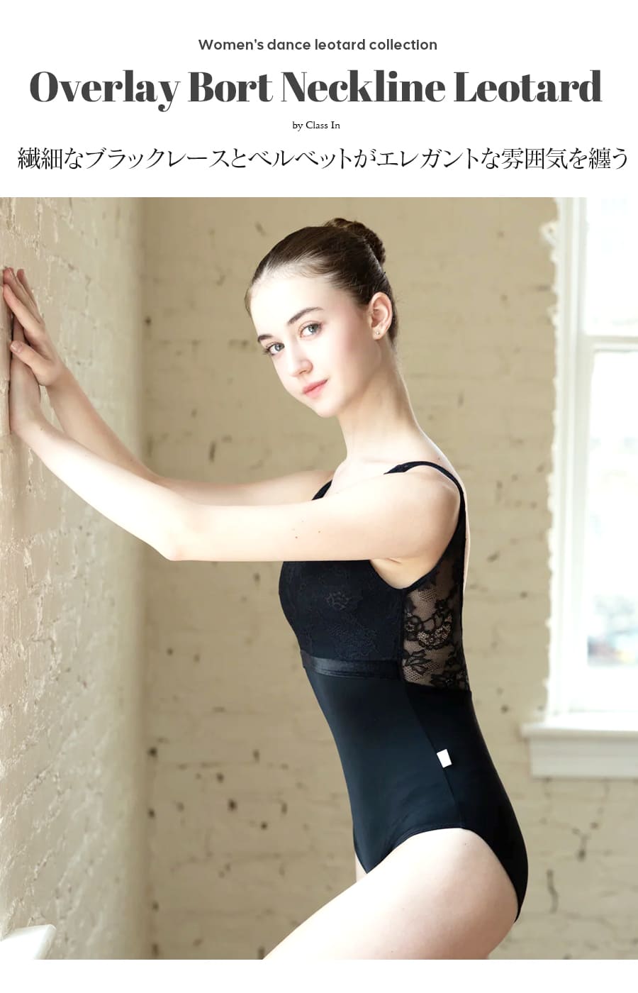高級感漂うブラックレースとベルベットの切り替えが美しく調和するボートネックラインのレオタード。