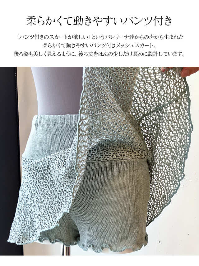 柔らかくて動きやすいパンツ付きメッシュスカート。