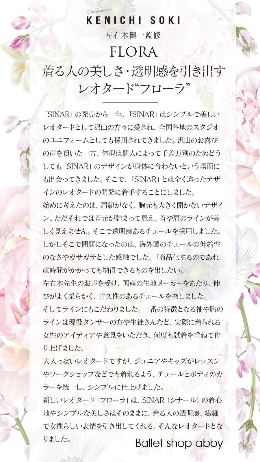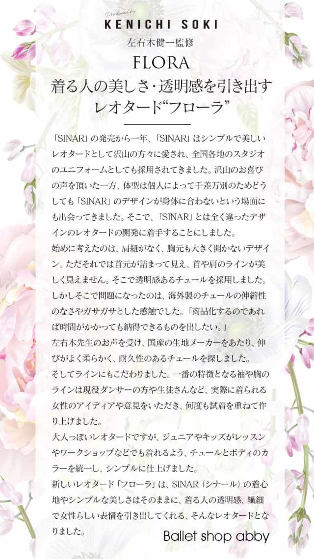 国内・海外問わずバレエコンクールにて審査員をつとめ、海外の有名バレエ校、全国各地のバレエスタジオの特別講師として国内外を飛び回っている「左右木健一先生」の監修による、オリジナルレオタード第2弾「FLORA」。