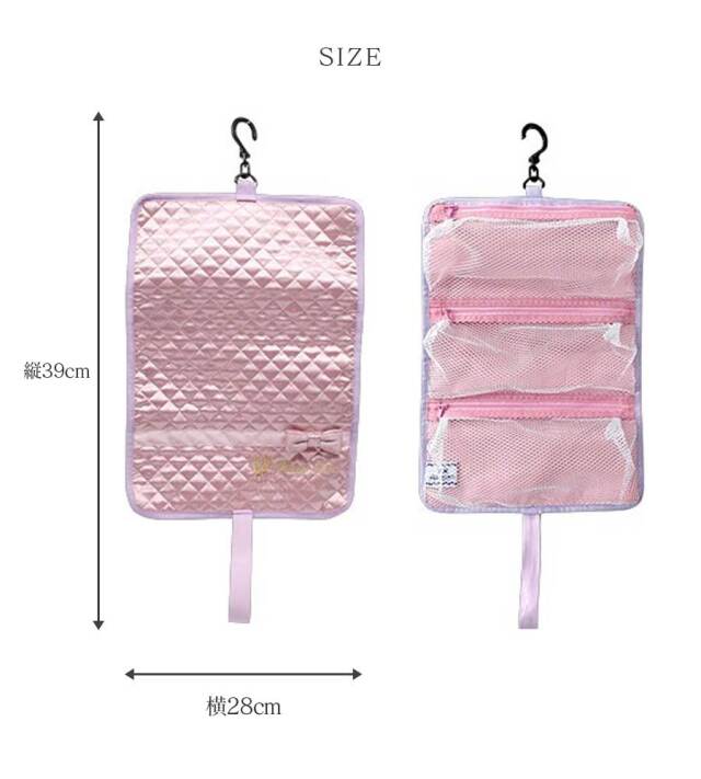 サテン&キルティングトウシューズロールケース。シューズを入れてそのまま干せるフック付き。丸めてコンパクトにバッグに収納OK。トウシューズ、バレエシューズが3足入ります。ほかにもトウパッドなどフットケア用品をいれても。