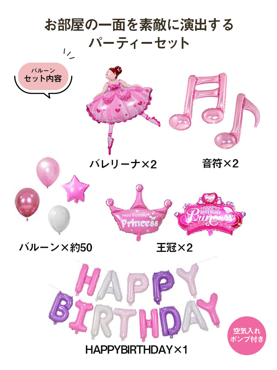 お部屋の一面を素敵に演出するバルーンセットです。 バレリーナの風船でバレエ大好きな方が喜びます。 誕生日会の飾り付け、記念日やお祝いのホームパーティを豪華に華やかに演出。 印象に残る日になること間違いなし! 空気入れや、風船を壁に留めるシールなど細かいところまでセットになっており バルーンは60点以上あるのでこれ1つで飾り付けは大丈夫!