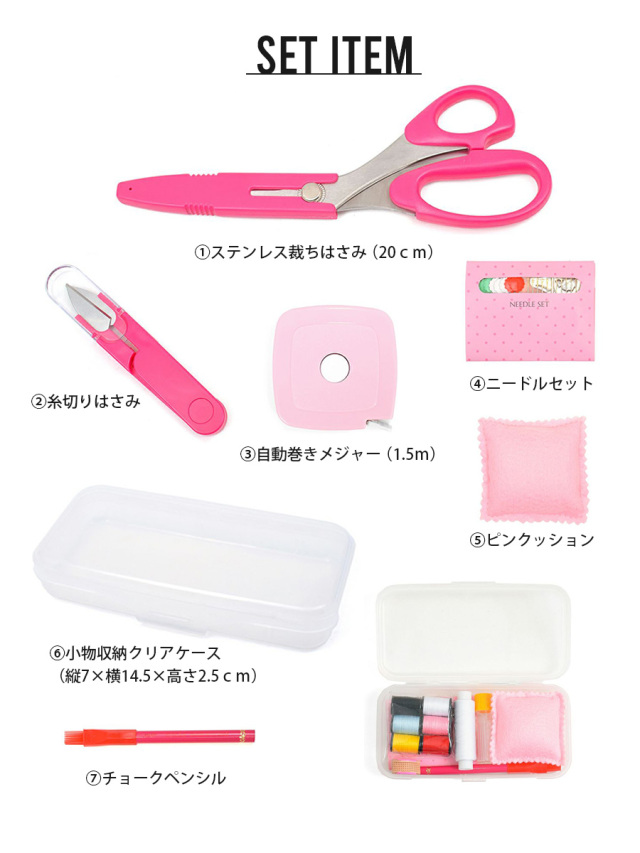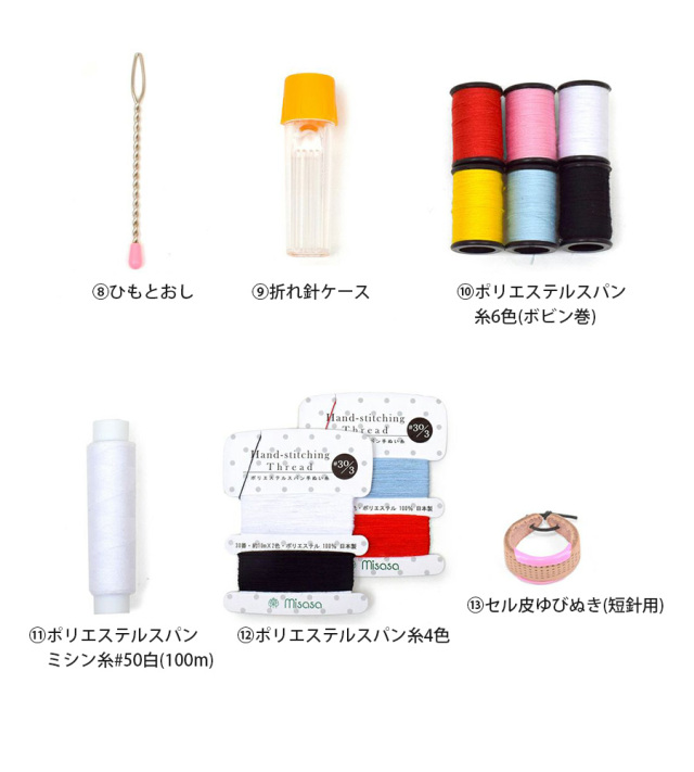 ニードルセット、ピンクッション、チョークペンシル、ひもとおし、折れ針ケース、ポリエステルスパン糸6色(ボビン巻)