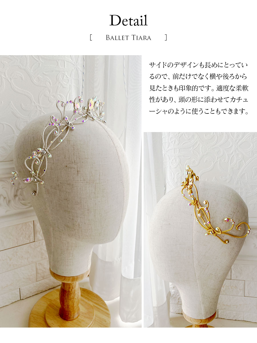に形を自由に変えられる自由度の高いバレエティアラ。チュールや櫛はついていないので、気になる方はご自身でお付けください。ピンを直接さして留めていただくタイプです。