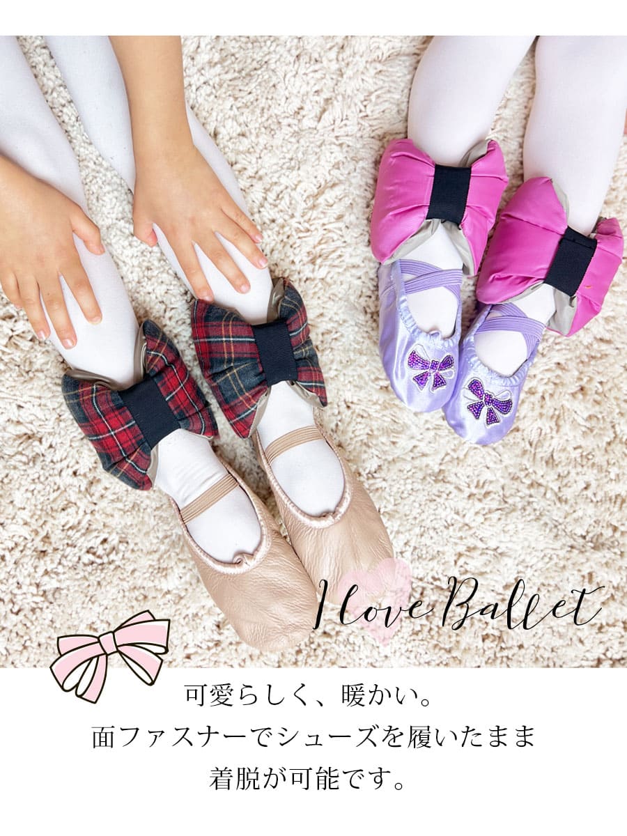 面ファスナータイプでシューズを履いたまま着脱ができるので、発表会・コンクールの待ち時間やレッスン時の冷え対策としてお使いいただけます。