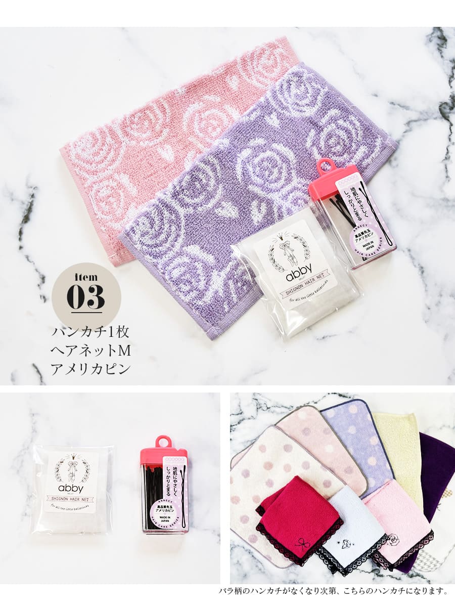 Mサイズヘアネットと頭皮に当たっても痛くなりにくいヘアピンのセット。ハンカチもふんわりとした手ざわりで使いやすいです。※ハンカチのお色は選べません。