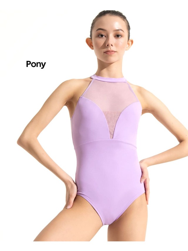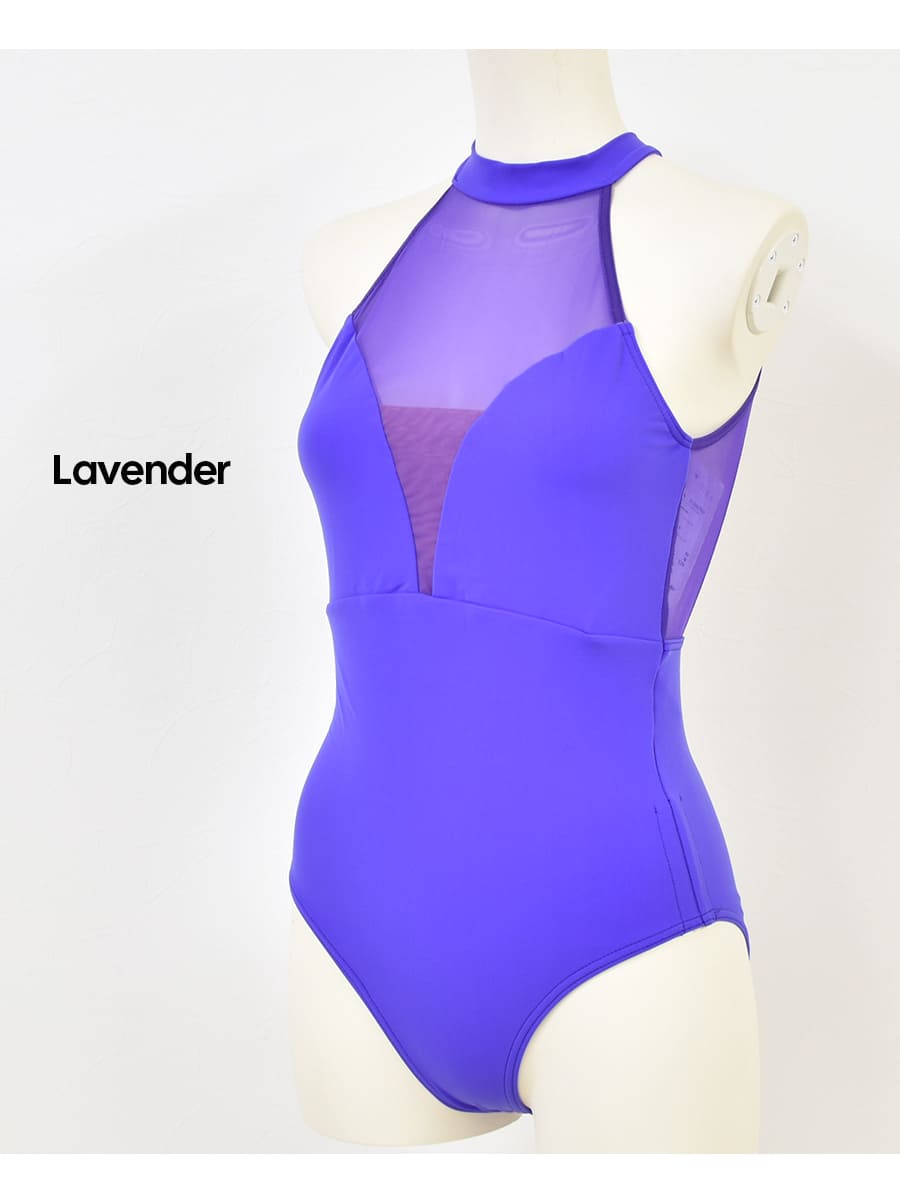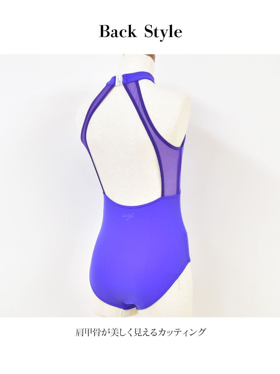 ハイネックのノースリーブレオタードは、ダブルメッシュのV字パネルと胸元のシームが特徴です。