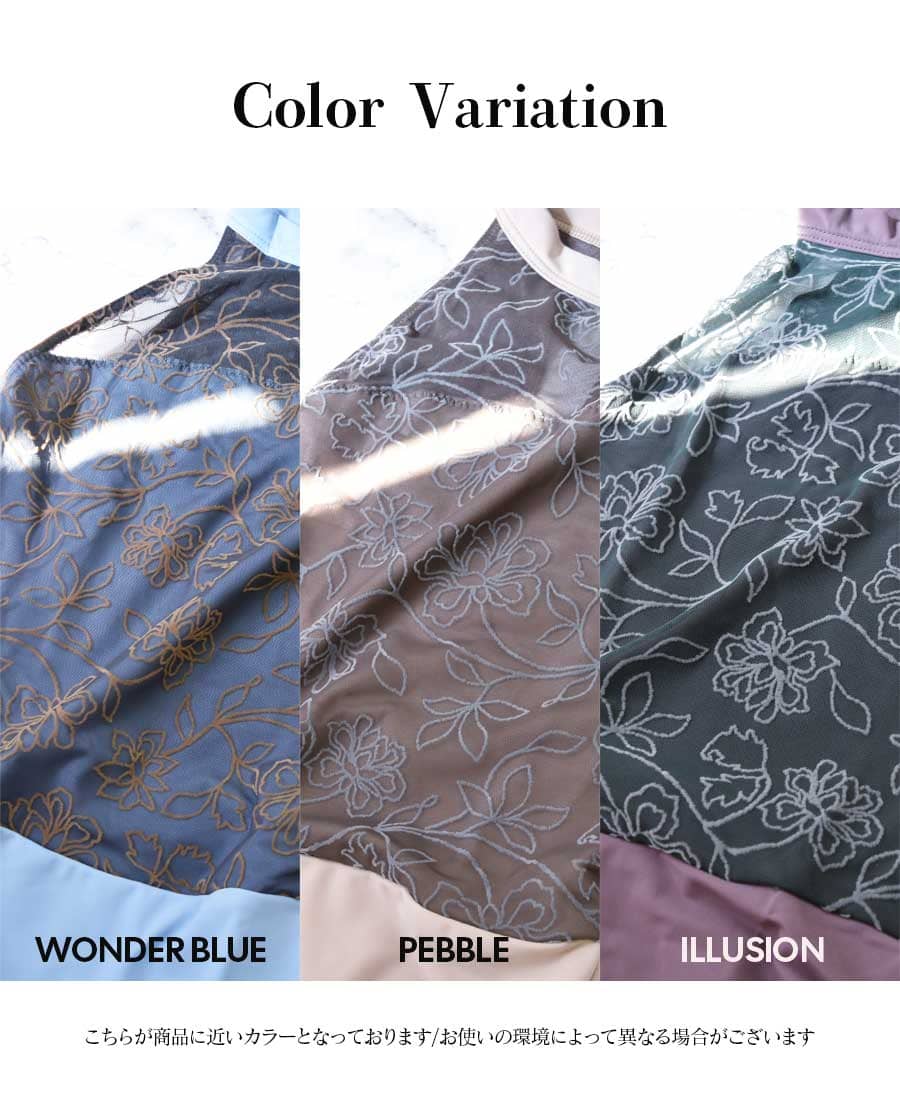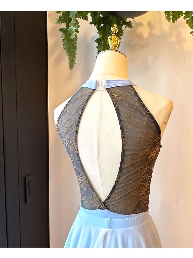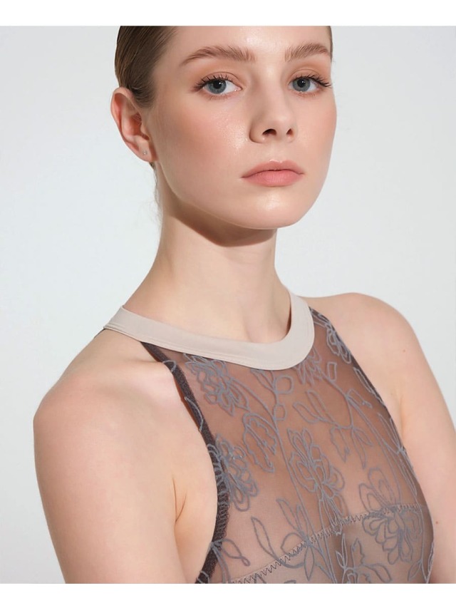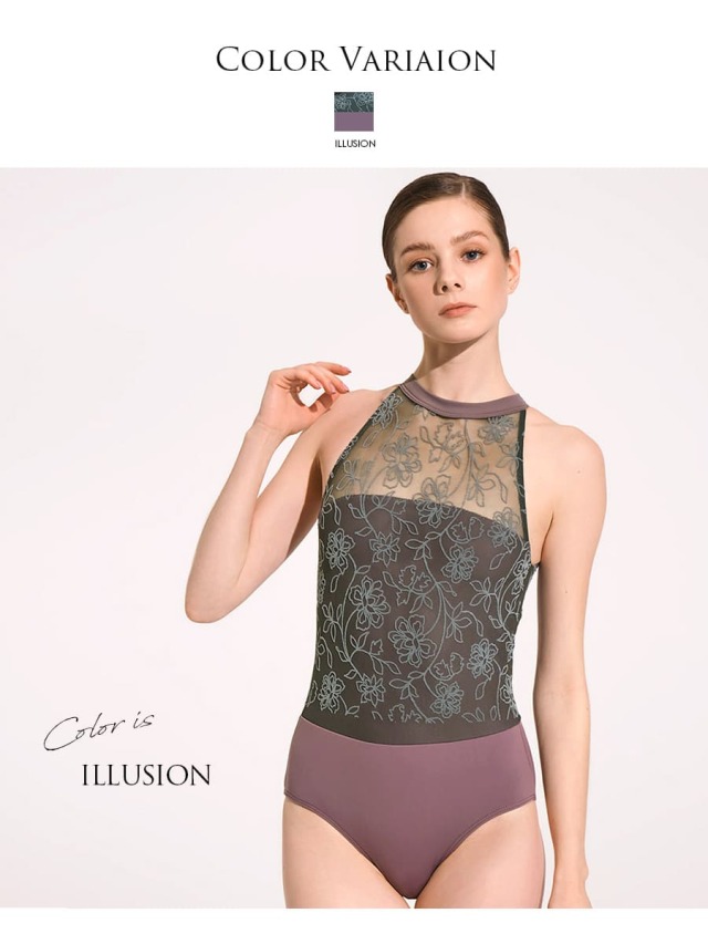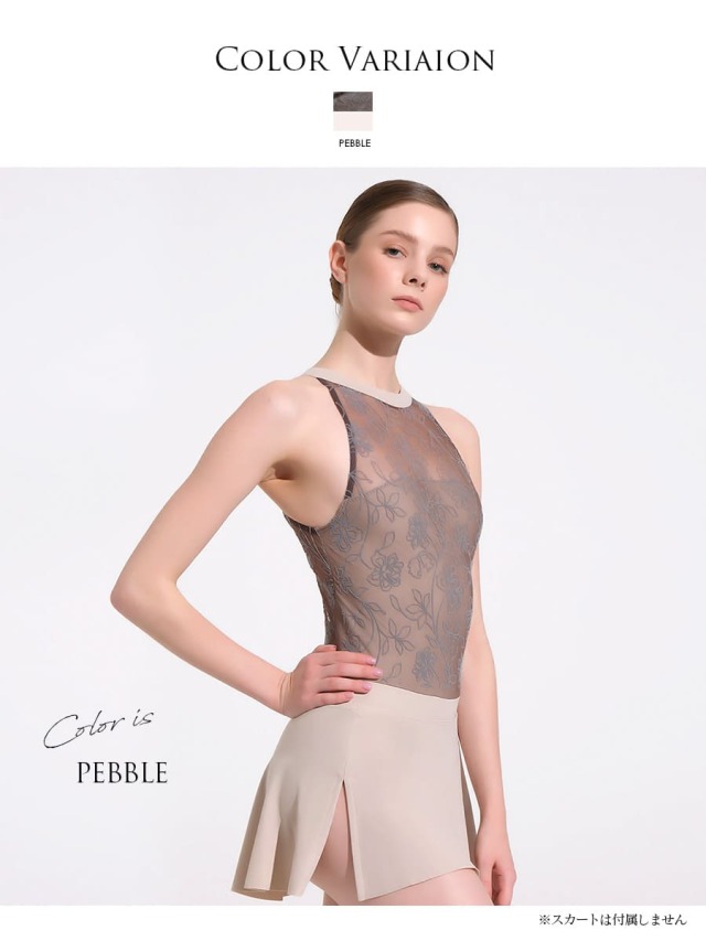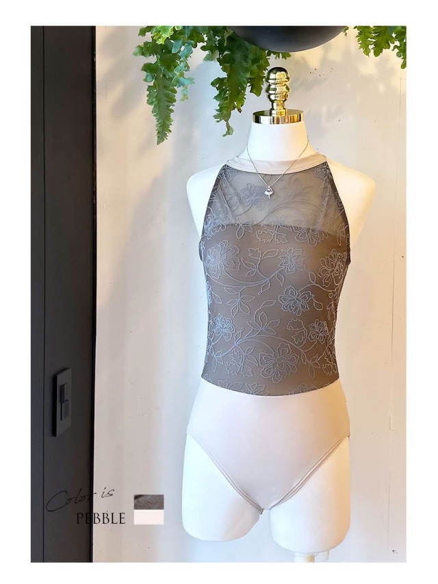 透け感のあるシアーメッシュとフロッキーレースを使用したレオタード。