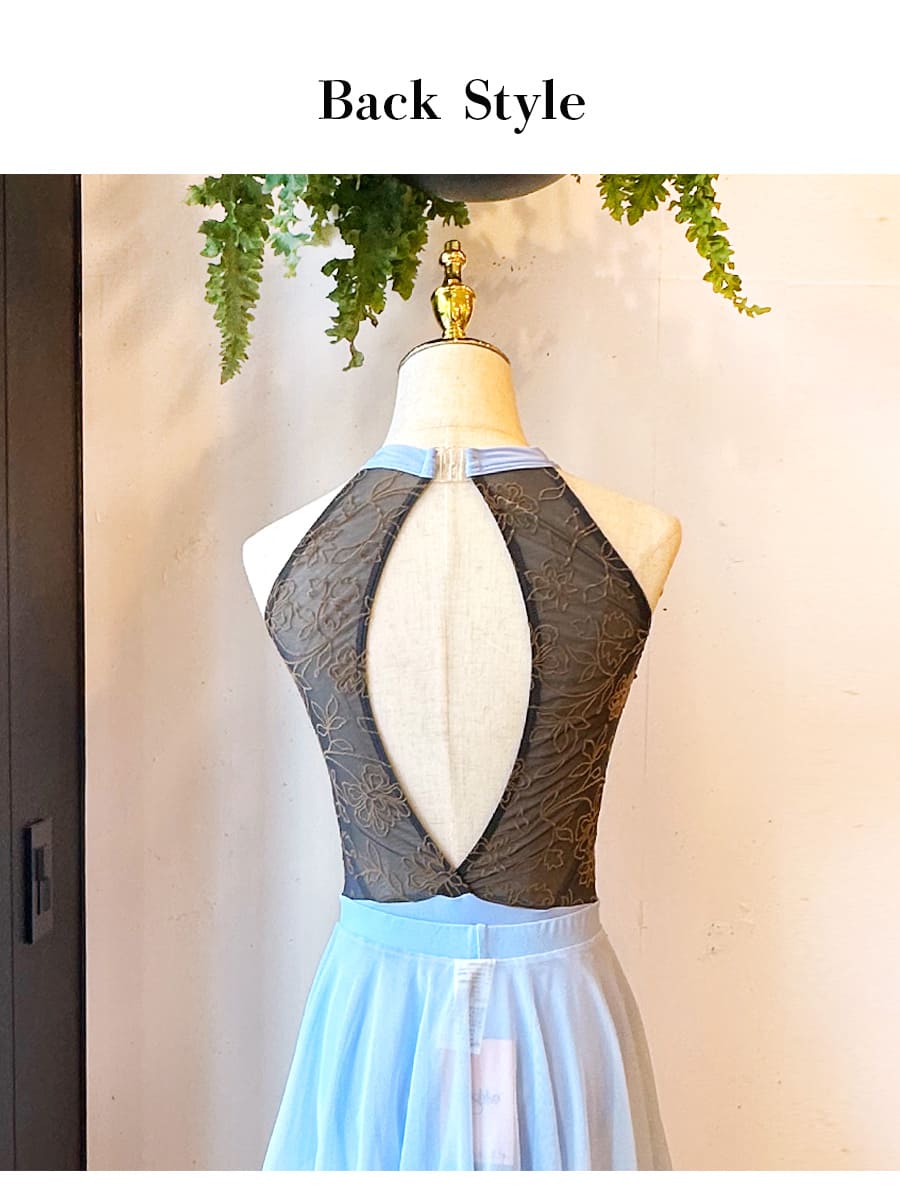首の後ろでホックで留めるホルターネックタイプで、背中の開いたバッグシルエットが魅力的です。