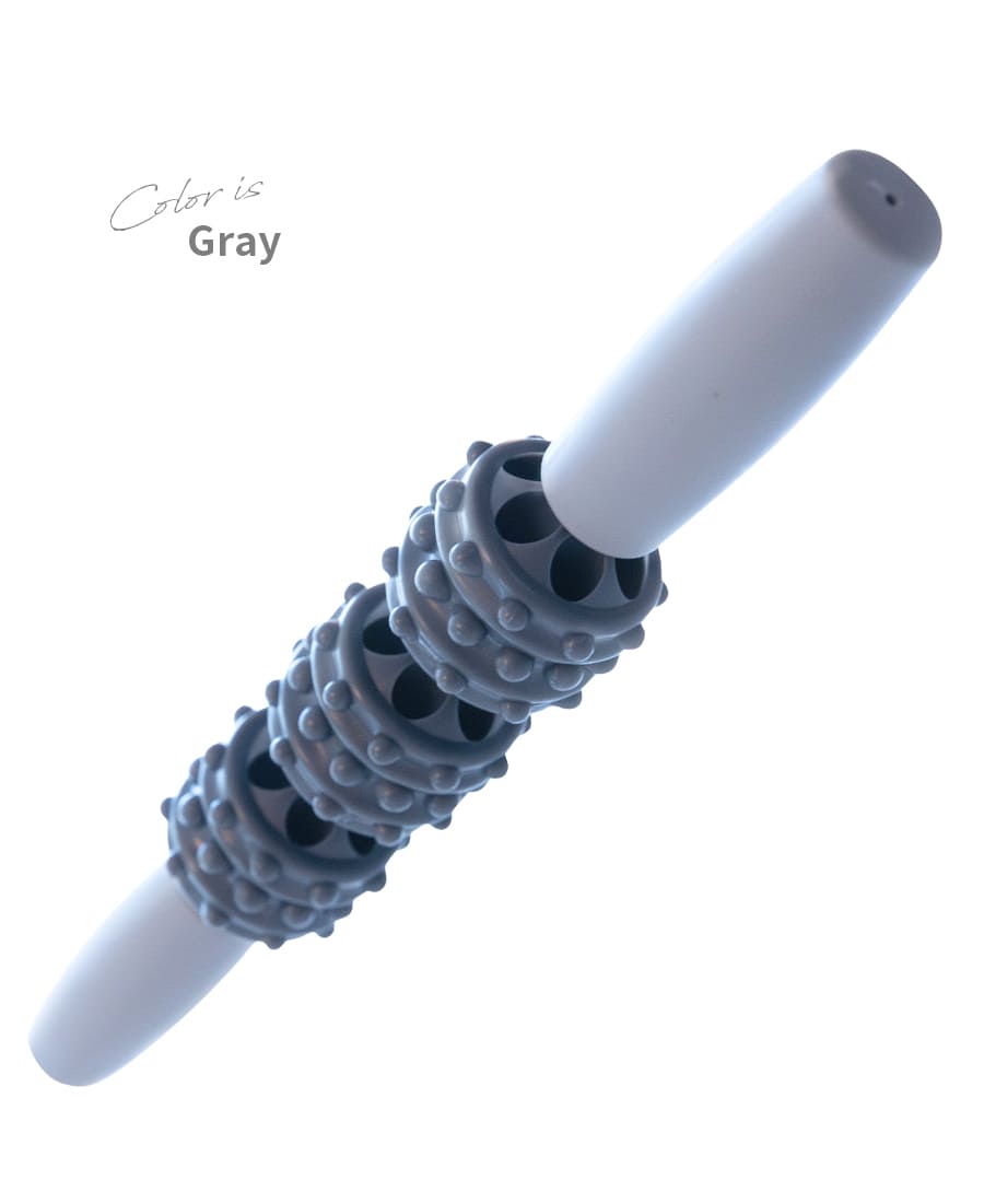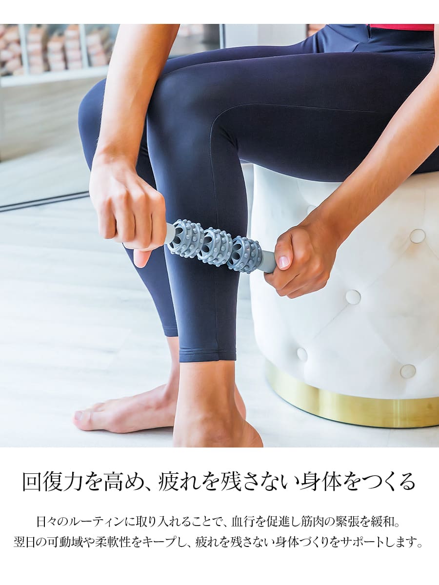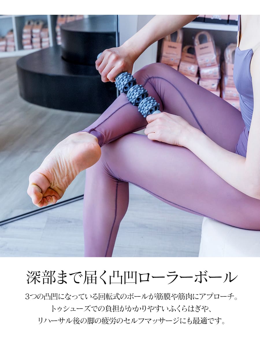 3つの凹凸ローラーボールが深層までしっかりとアプローチし、ふくらはぎや太ももなど、トゥシューズで負担がかかりやすい脚のセルフケアに最適。