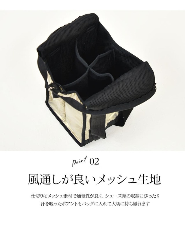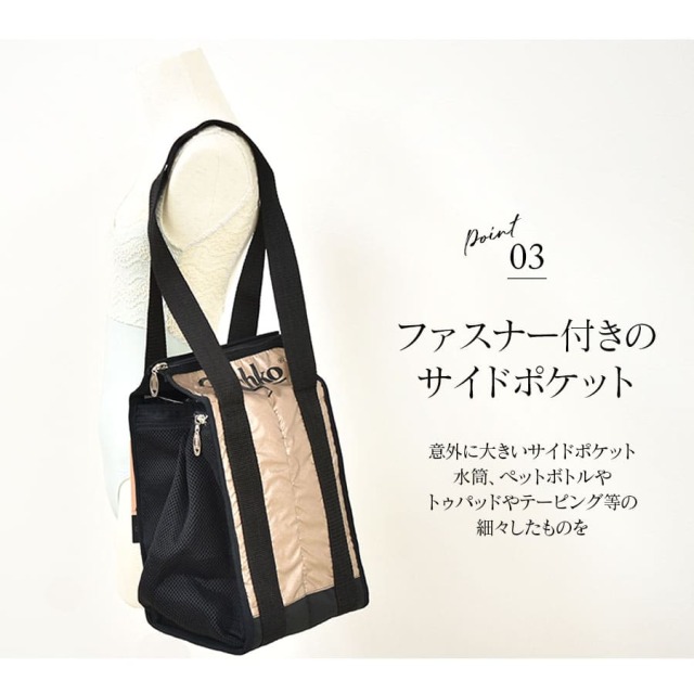 素材は100%ポリエステル生地。メッシュ生地で作られているので通気性良くレッスン後の汗をかいたシューズを入れるのにはぴったりです。ファスナー部分にはラインストーン付きのチャームがポイント。