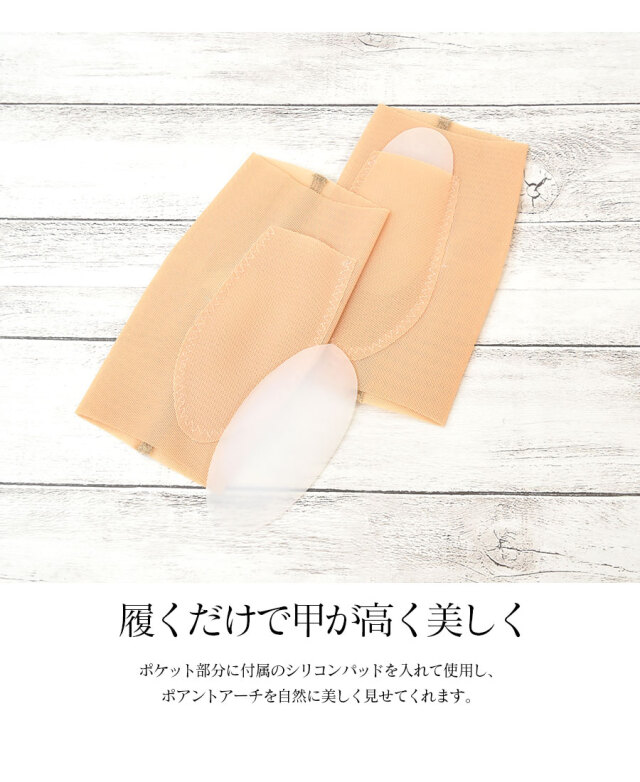 履くだけで甲を高く美しく見せてくれるパッド。ポケット部分に付属のシリコンパッドを入れて使用し、アーチを自然に美しく見せてくれます。