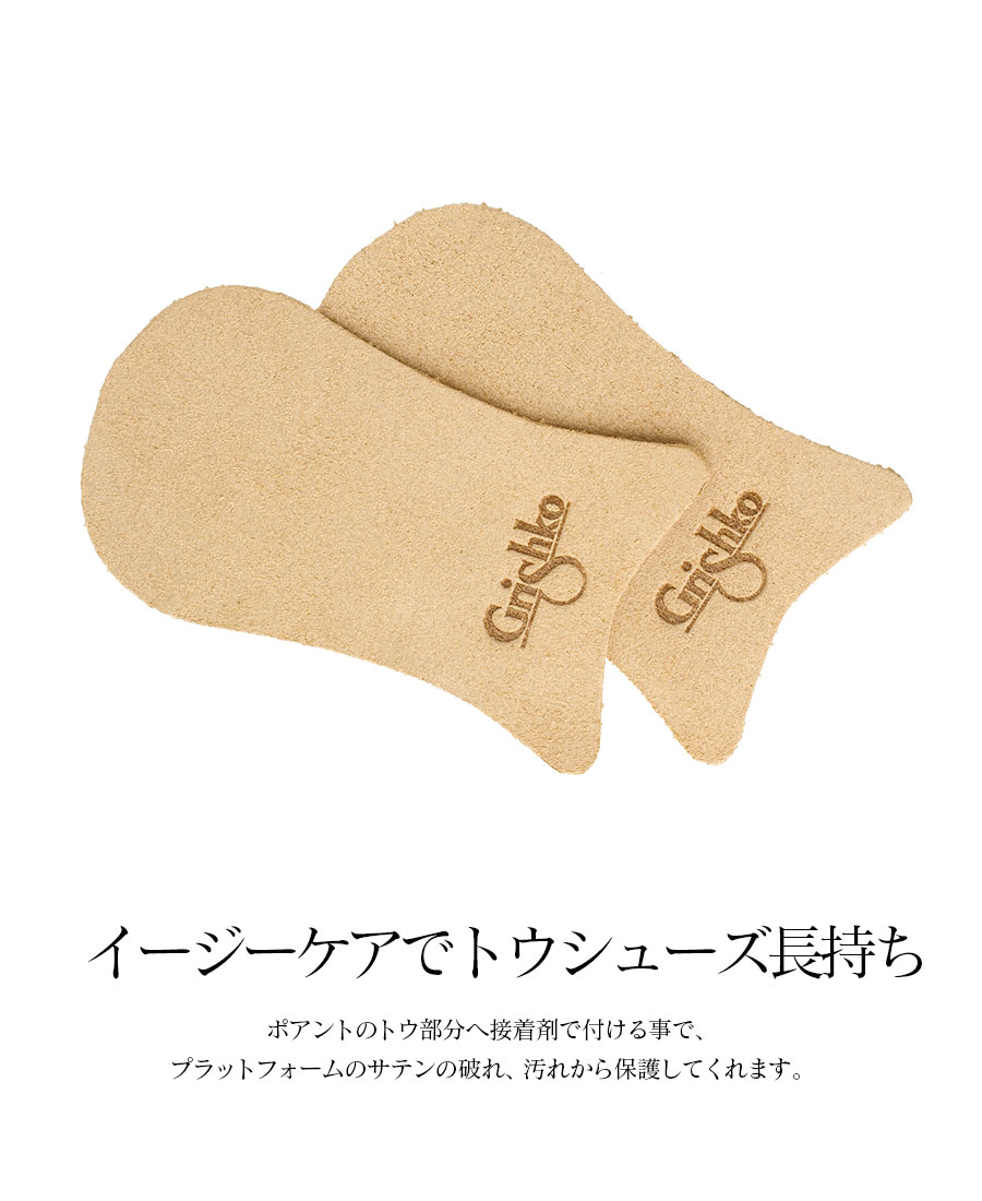 ポアントのトウ部分へ接着剤で付ける事で、滑りにくくなり、プラットフォームのサテンの破れ、汚れから保護してくれます。薄手で貼りやすくボンド等でしっかり接着できます。