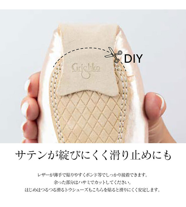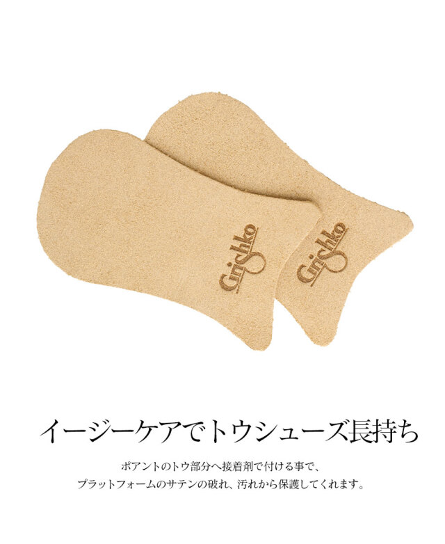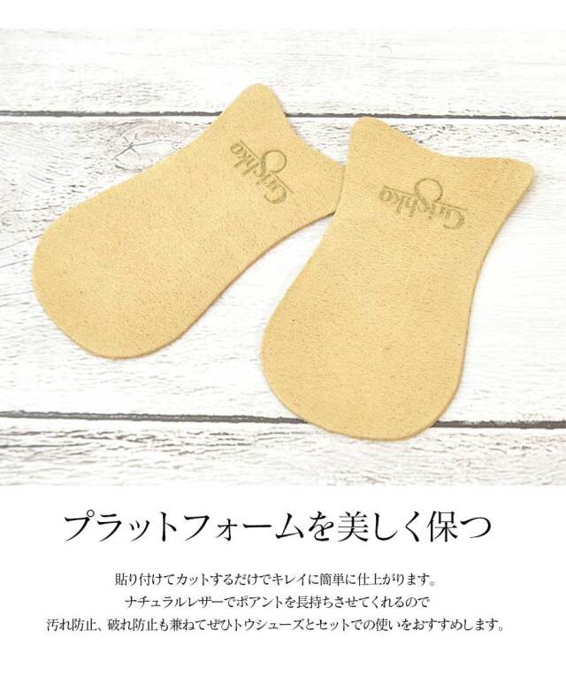 はじめはツルツル滑るトウシューズもこちらを貼ると滑りにくく安定します。ナチュラルレザーでポアントを長持ちさせてくれるので汚れ防止、破れ防止も兼ねてぜひトウシューズとセットでの使いをおすすめします。