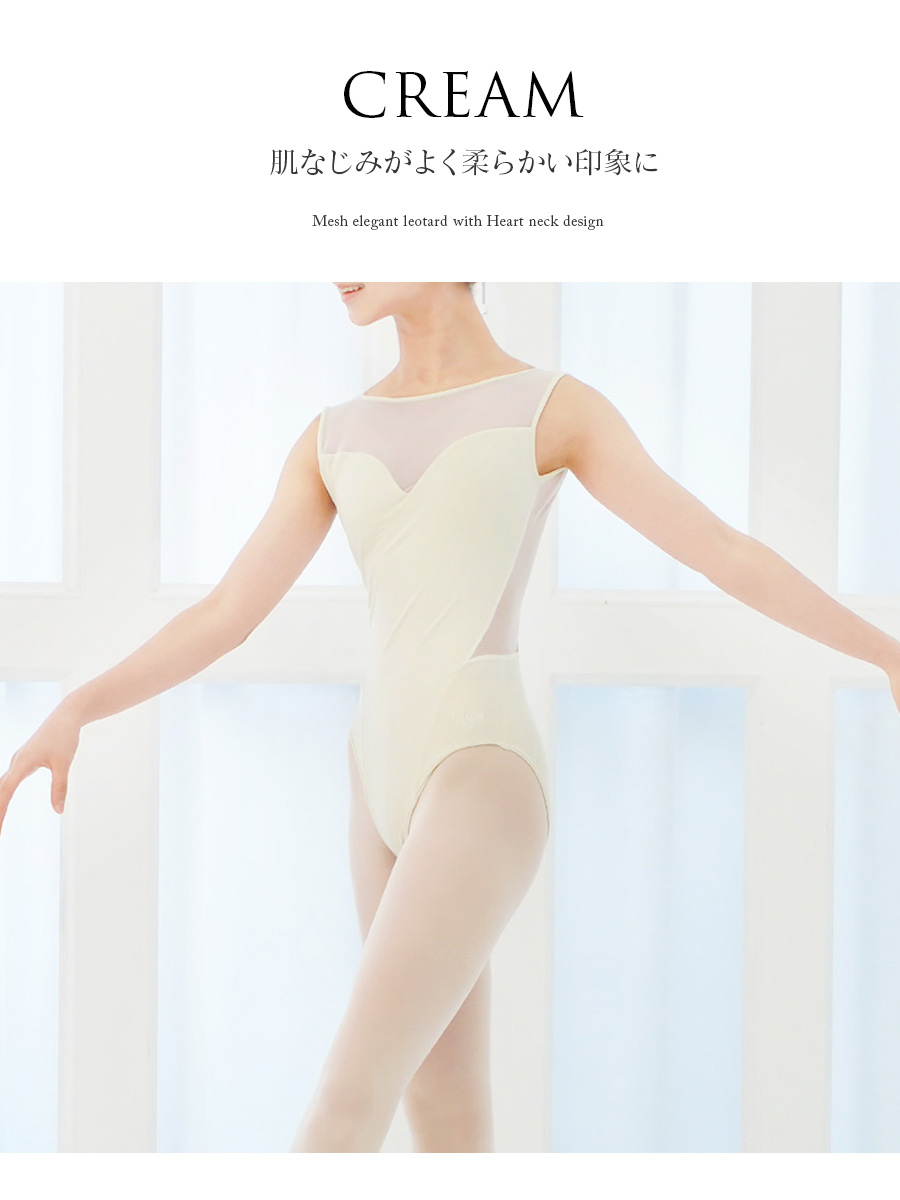 グリシコ ボリショイスターズシリーズ。 胸元のハート型のカット、バックメッシュのカシュクールデザインが素敵なタンクレオタード。 ウエストはサイドの方までメッシュ使いとなっていてキレイなシルエットをつくることができます。
