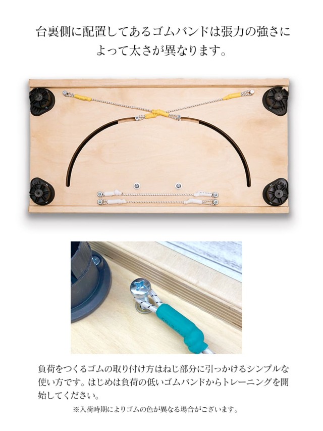 | The rubber band placed on the back side of the table has a strong tension. Therefore, the color and thickness are different.A simple way to attach the rubber that creates the load is to hook it on the threaded part. Start training with low-impact rubber bands. |