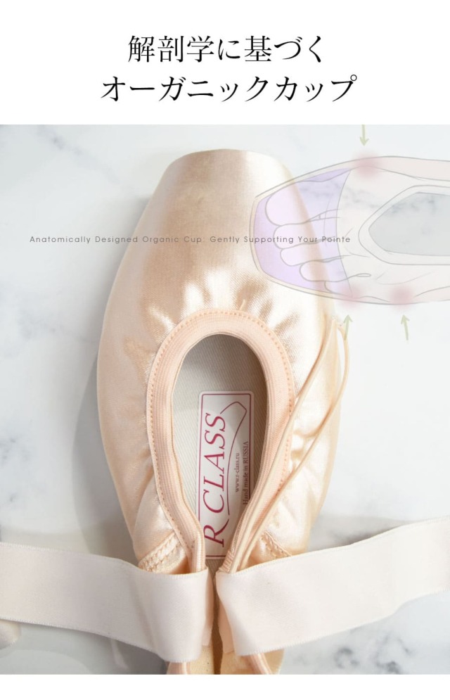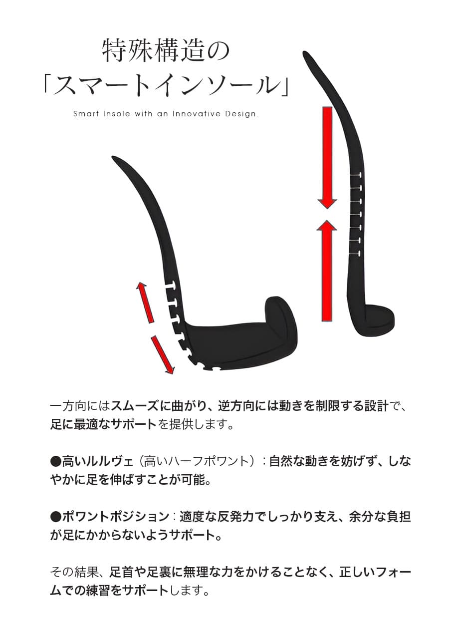 ・あえて後ろ側の角を滑らかに設計。そのため、ハイポワント(高いルルヴェ)からポワントへの移行動作を、惰性ではなく自分の筋力とコントロールで習得することができます。