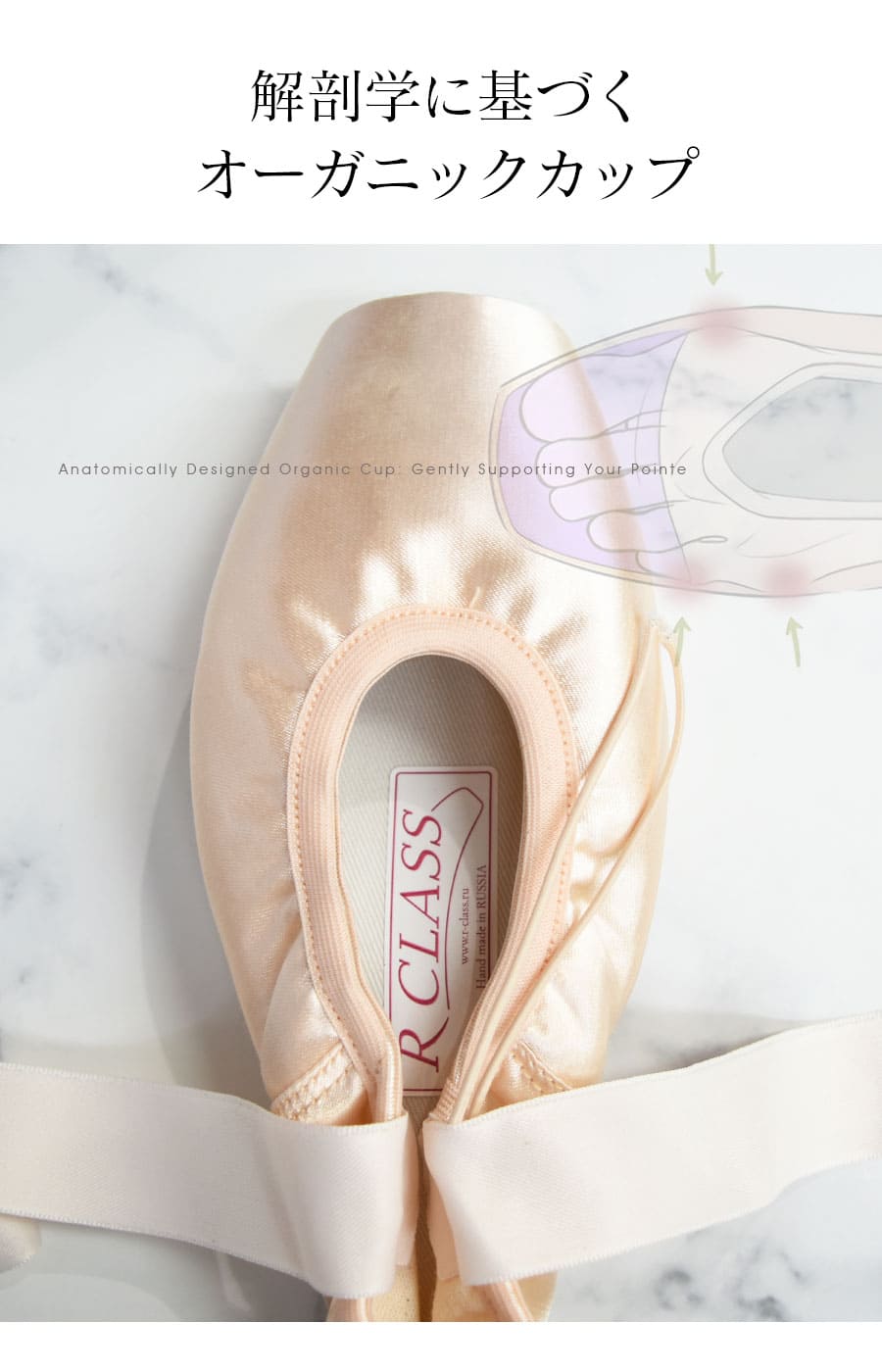 R-CLASS(アールクラス)は、ロシア発の名門トウシューズブランドで、1990年代初頭よりボリショイ劇場の職人技術を背景に設立されました。実際のダンサー(特にボリショイバレエ団)のテストに基づき改良されてきた設計は、まさに伝統と革新が融合した逸品です。現在も200名以上の職人の手によって一足一足丁寧にハンドメイドされており、世界最大級のトウシューズメーカーとして知られています。