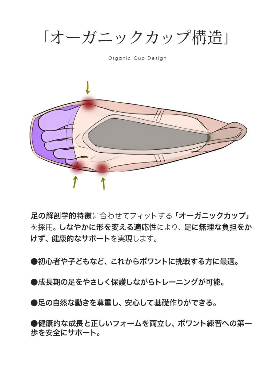 ・健康的な成長と正しいフォームを両立できる設計で、ポワント練習への第一歩を安全にサポート。