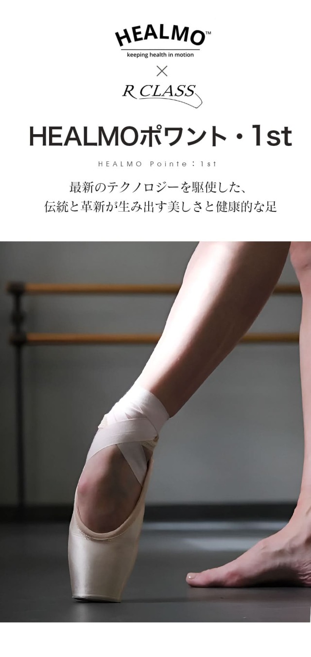 クラシックバレエシューズの構造を改良し、ポワント使用に向けて足を準備するための理想的なシューズを開発。「HEALMOポワント・1st」は、足の筋力や柔軟性を無理なく育て、正しい動きをサポートすることで、ポワントワークの基礎をしっかりと築くことができます。