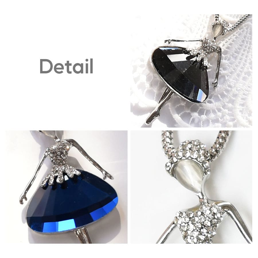 ヘッドと衣装の部分にラインストーンをあしらい、スカートの部分は大き目ビジューで存在感があるネックレスです。