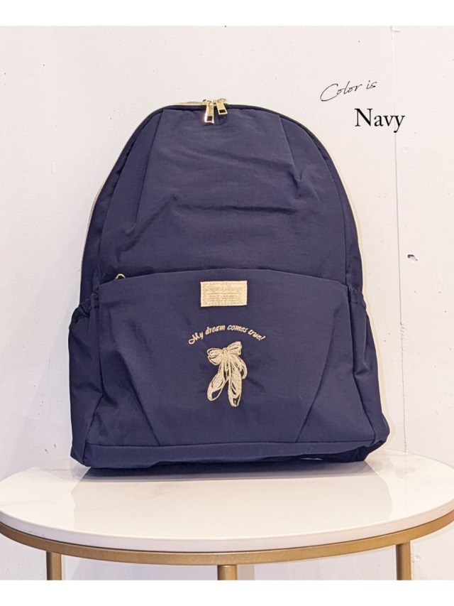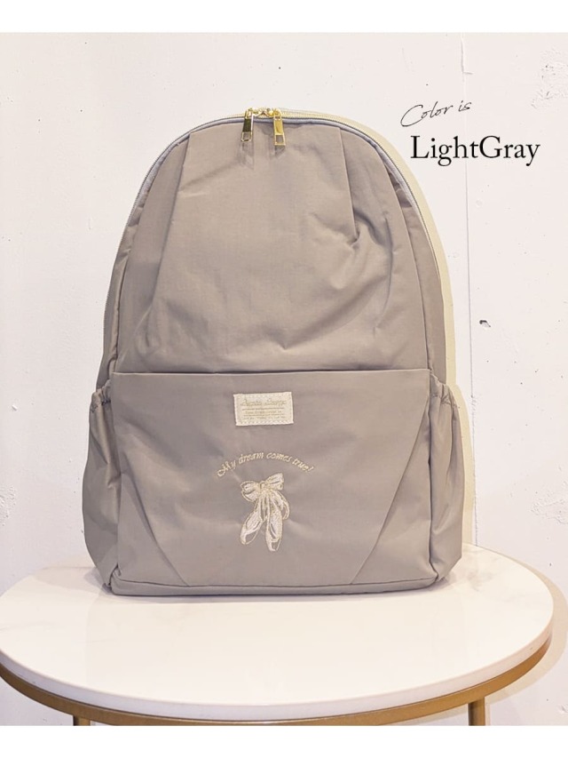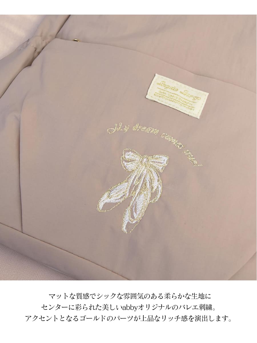 マットな質感でシックな雰囲気のある柔らかな生地にセンターに彩られたabbyオリジナルの美しいバレエ刺繍が思わず目を惹く大人可愛い軽量レッスンバッグ。