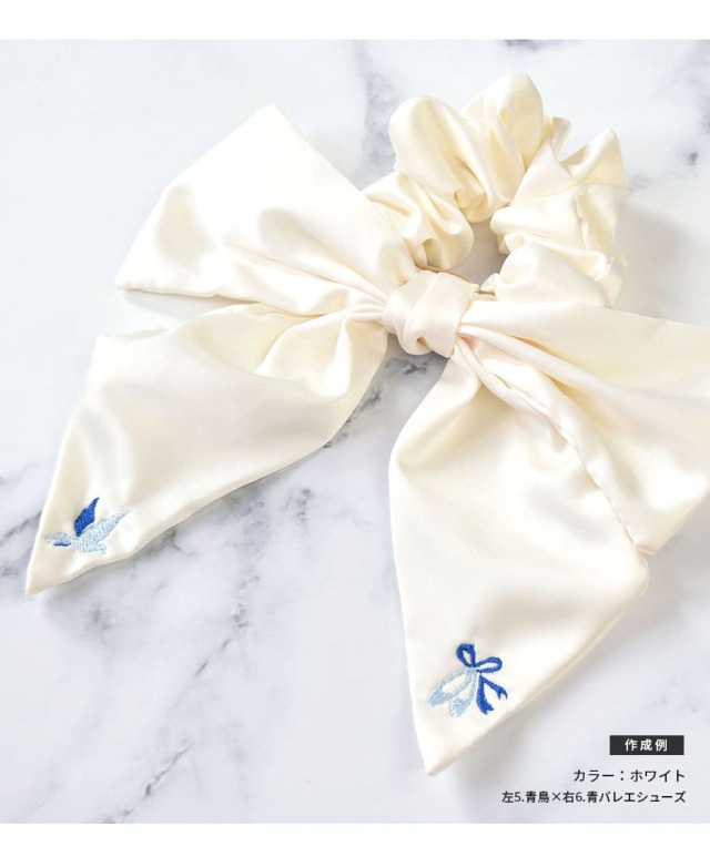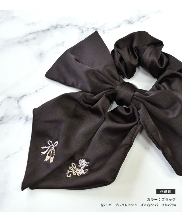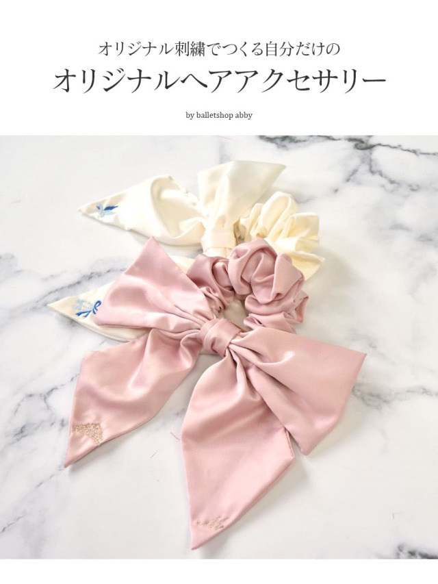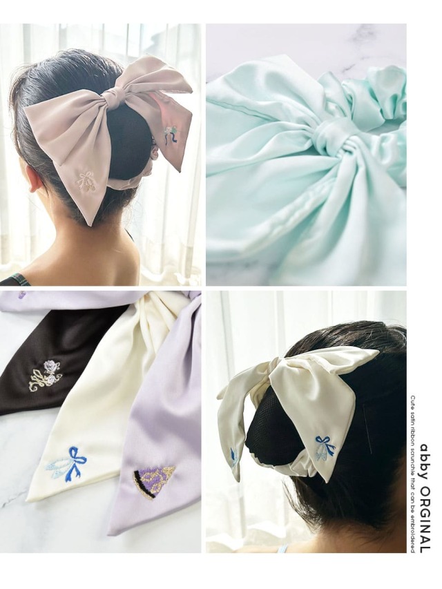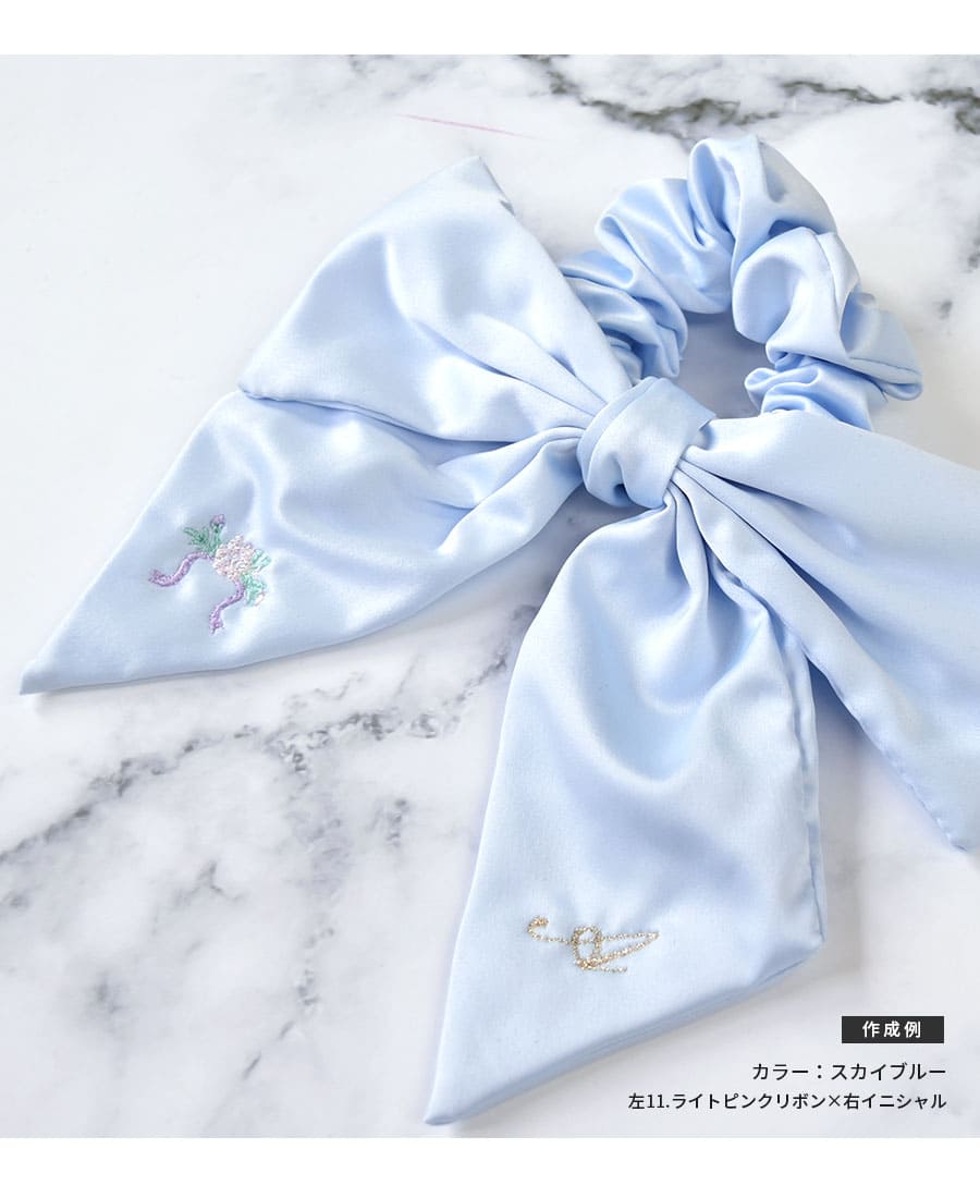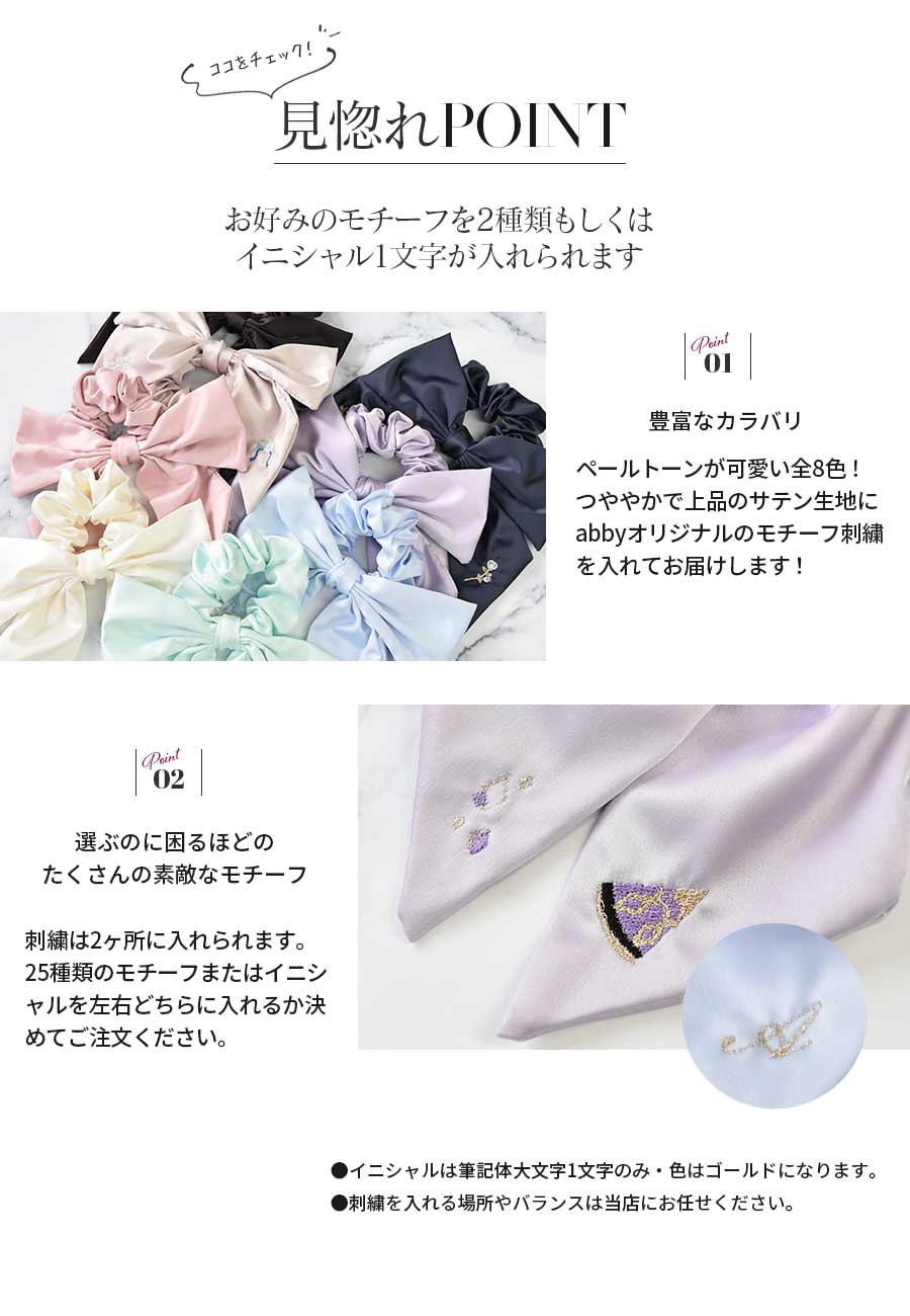 abbyオリジナルのモチーフ刺繍(またはイニシャル1文字)を入れてお届けします!上品なサテンのリボンが目を惹くとっても可愛いシュシュです。