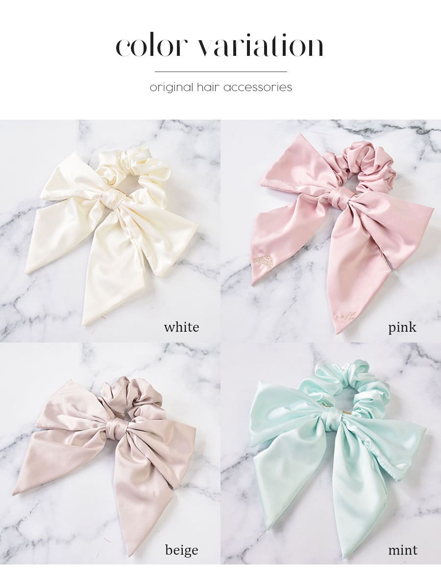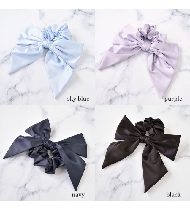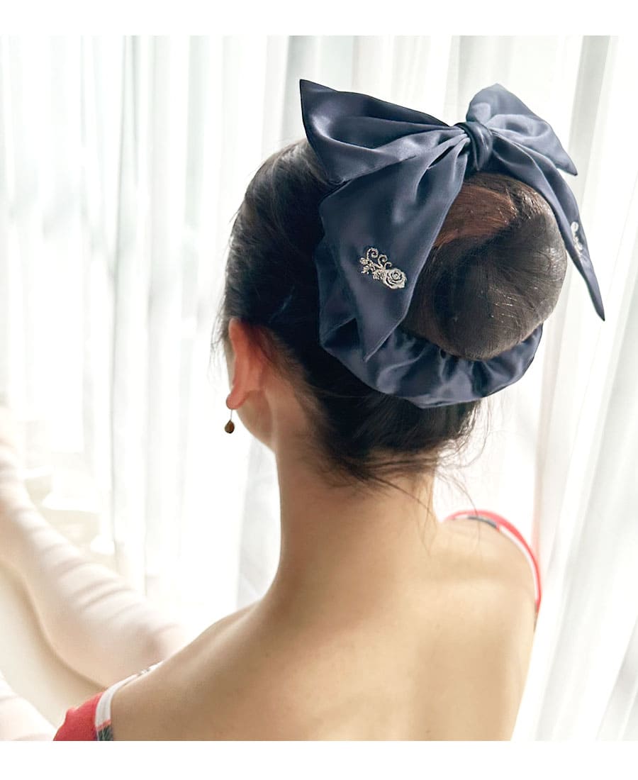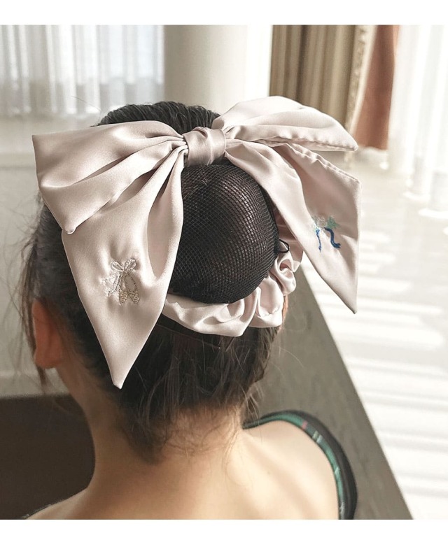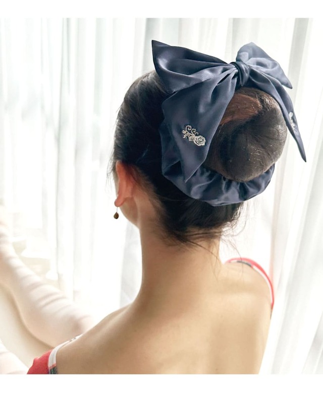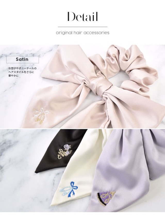 abbyオリジナルのモチーフ刺繍(またはイニシャル1文字)を入れてお届けします!上品なサテンのリボンが目を惹くとっても可愛いシュシュです。