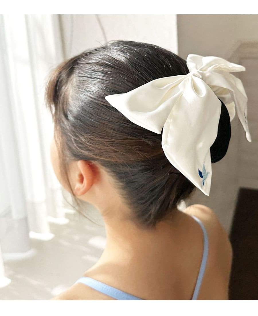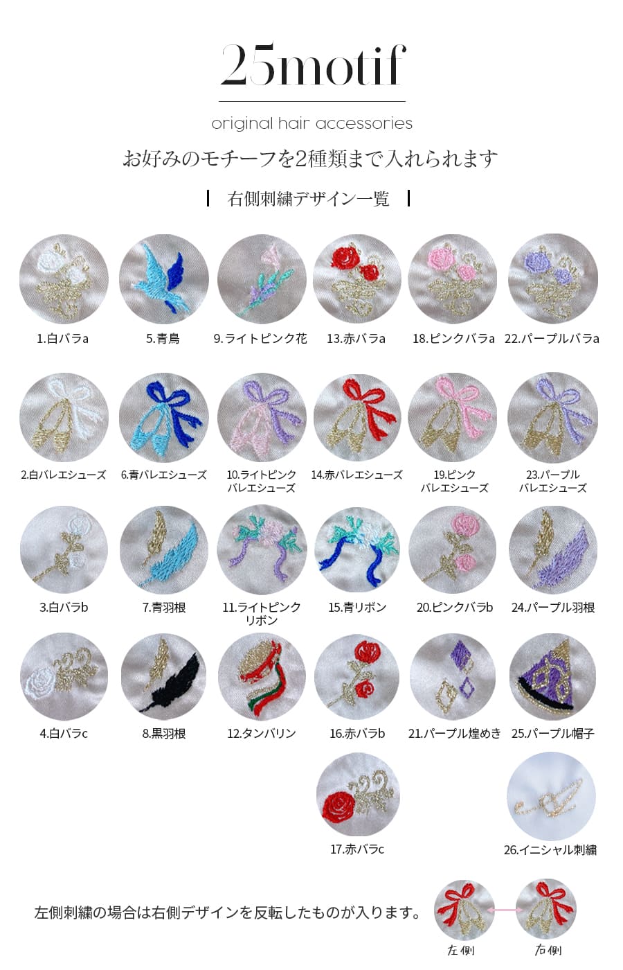 リボンの足の部分に刺繍が入ります。全26種類のモチーフと8色のカラーの組み合わせで自分だけのヘアアクセに♪