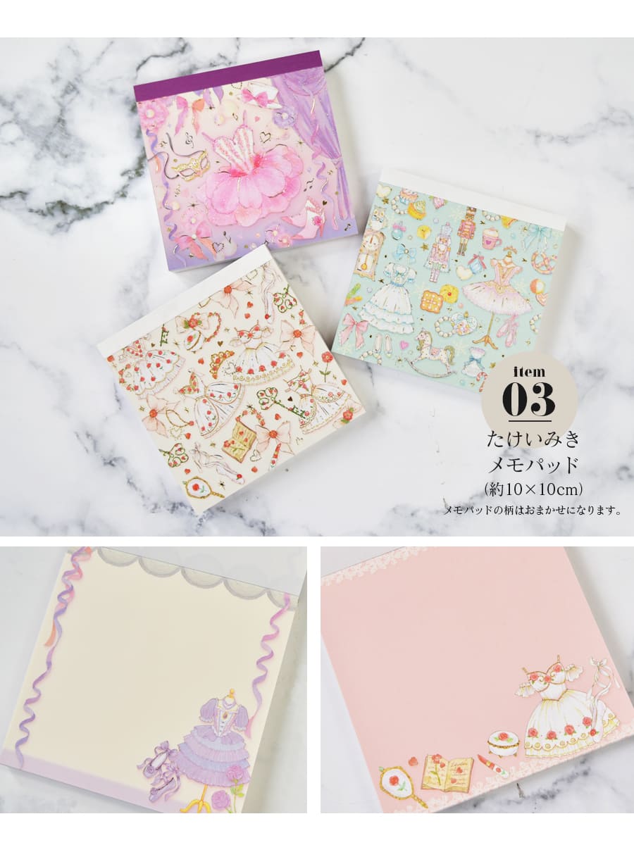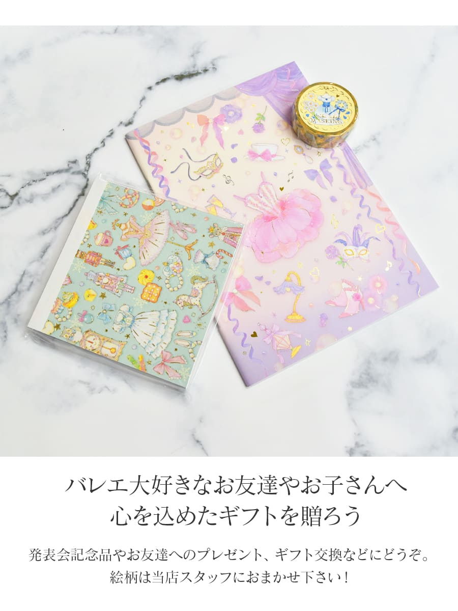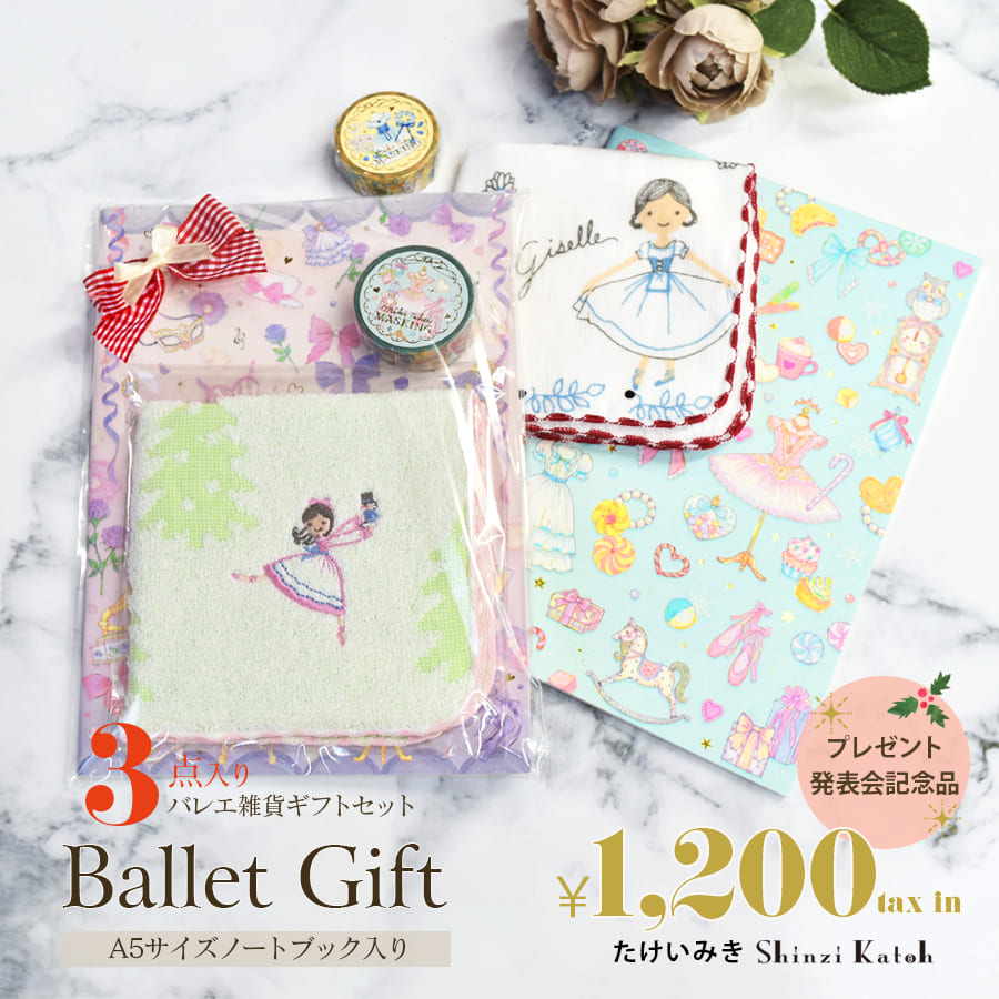 たけいみきさんのキラキラ輝くようなバレエの世界を表現した雑貨を3点セットのギフトに♪ 高価な物を贈るだけではなく、日頃のお礼の気持ちやちょっとしたお祝いの気持ちをこめて。日常使いにぴったりな素敵な雑貨のプレゼントはいかがでしょう。 もちろん、発表会記念品やお友達へのプレゼント、ギフト交換などにお使いいただけます。 単品で買うよりもとってもお得なので、お手頃価格でたくさん必要な時におすすめです。教室から生徒さんへのプレゼントや価格の決まったプレゼント交換などにお使いください。 絵柄は当店スタッフにおまかせください!心を込めてお届けします!こちらはラッピングされた状態での配送になります。