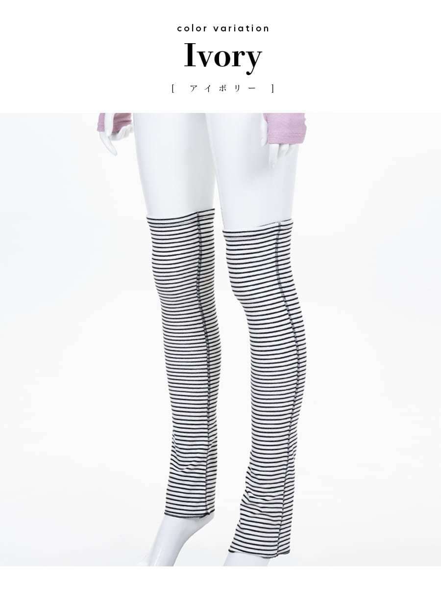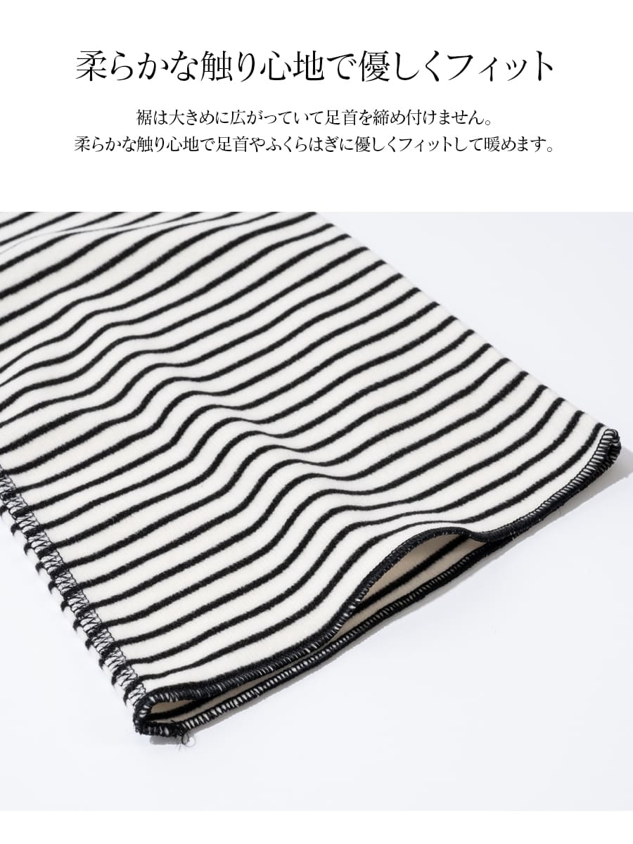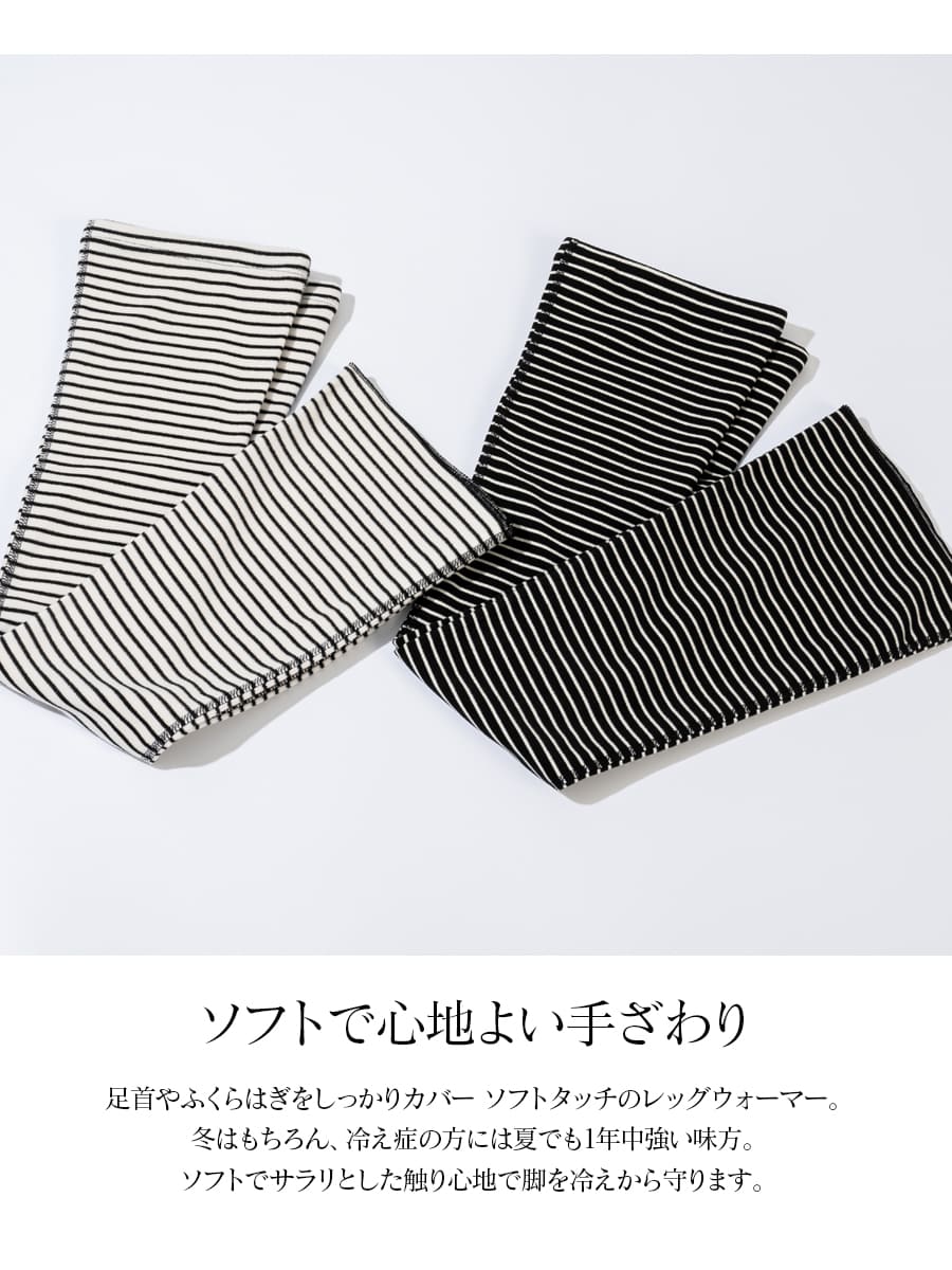 レッスン中やコンクール会場などで足を温め冷やさない、サラサラした着け心地の細ボーダーソフトレッグウォーマー。