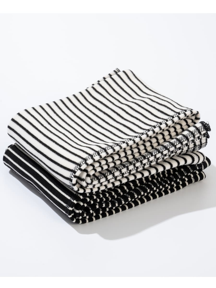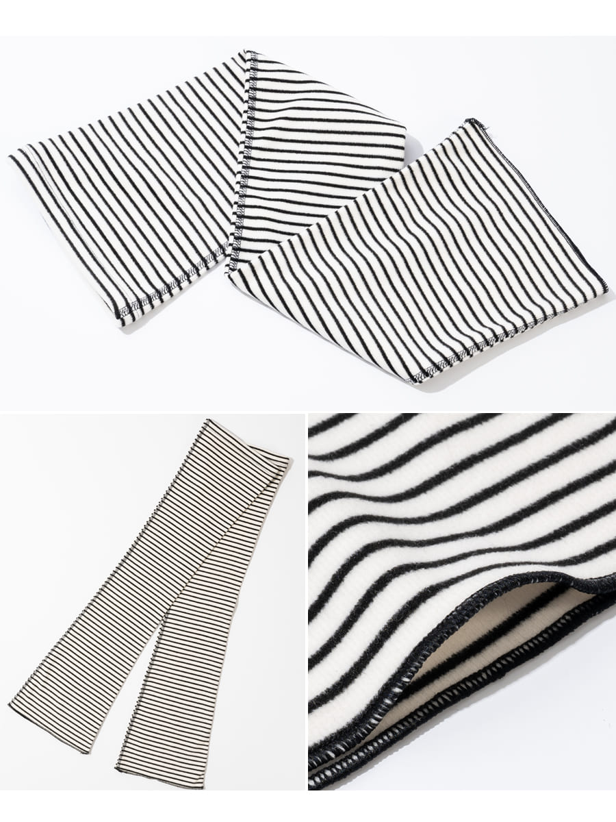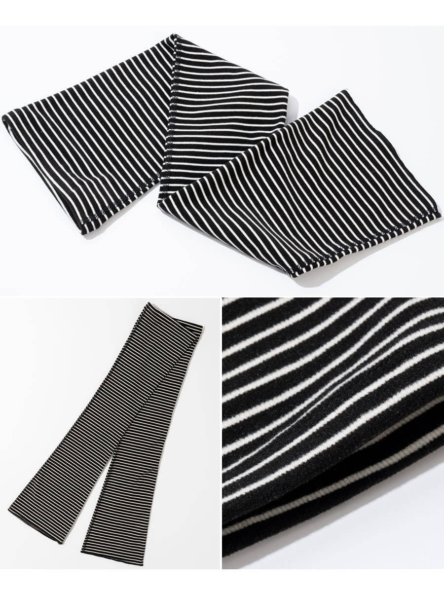 レッスン中やコンクール会場などで足を温め冷やさない、サラサラした着け心地の細ボーダーソフトレッグウォーマー。