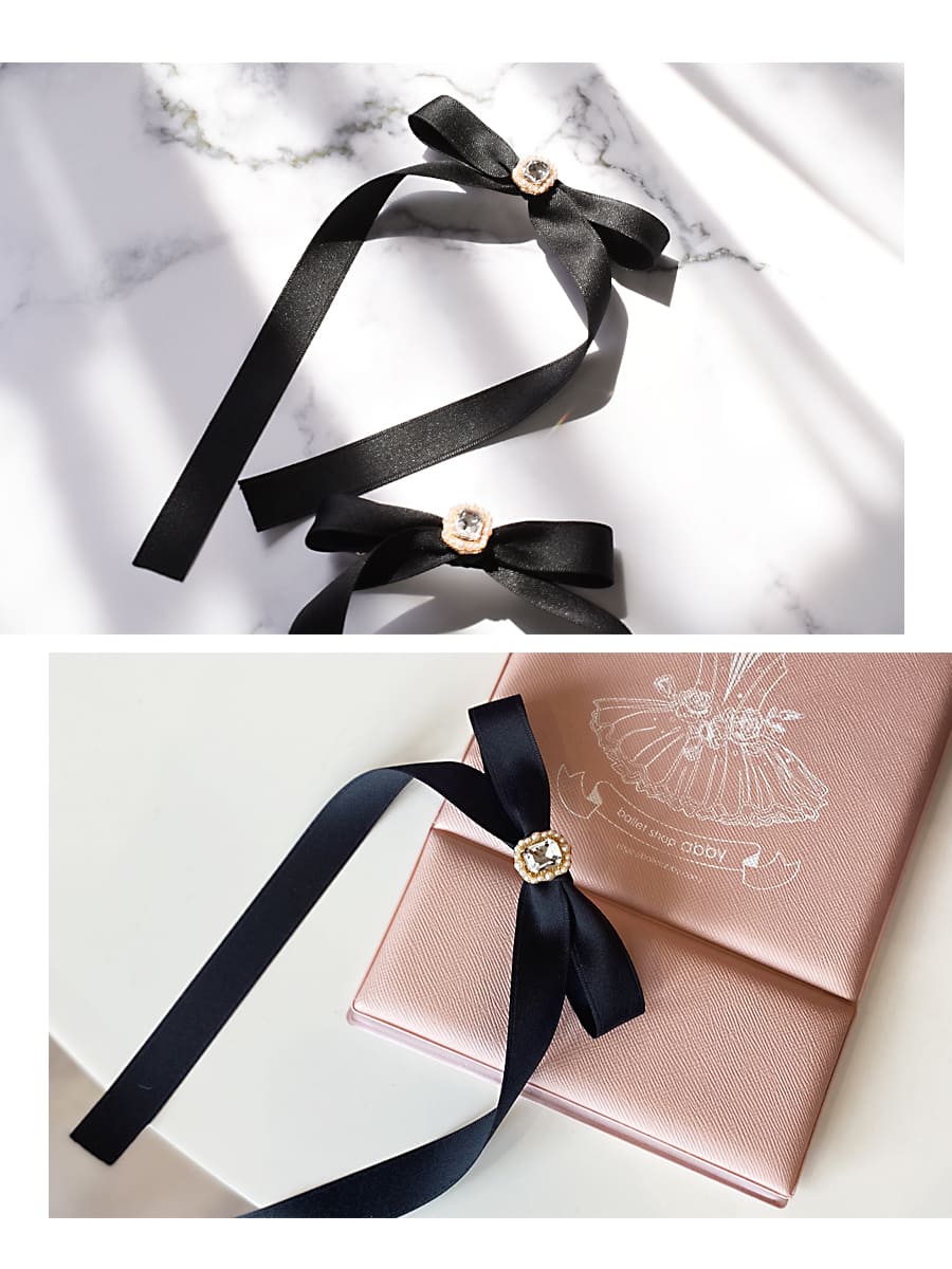 輝くビジュー&パール付きのリボンバレッタ。 ハーフアップのアクセントやお団子に付けても可愛い♪ シンプルなデザインなので普段使いはもちろん、お呼ばれの席にもピッタリ! リボンの長さをお好みの長さにカットすることも可能です。