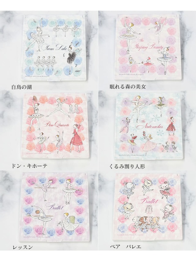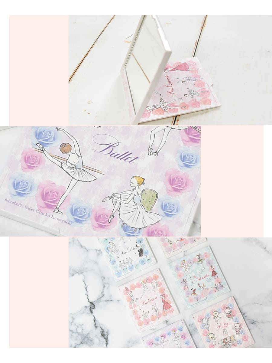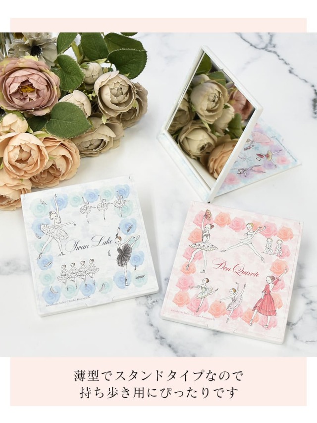 カワグチイツコさんによる愛らしく美しいバレエの世界。 人気のイラストがスクエア型ミラーになりました。 コンパクトサイズで持ち歩くのにも丁度良い♪ スタンドタイプなので楽屋でのメイクチェックにも便利です。