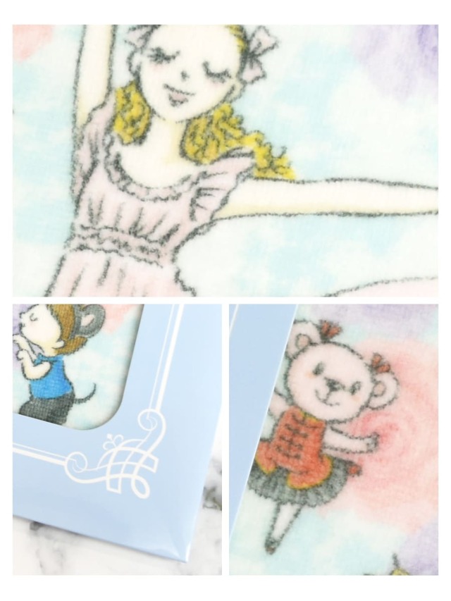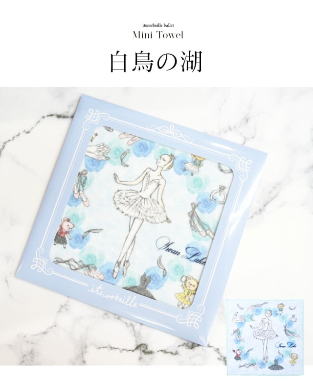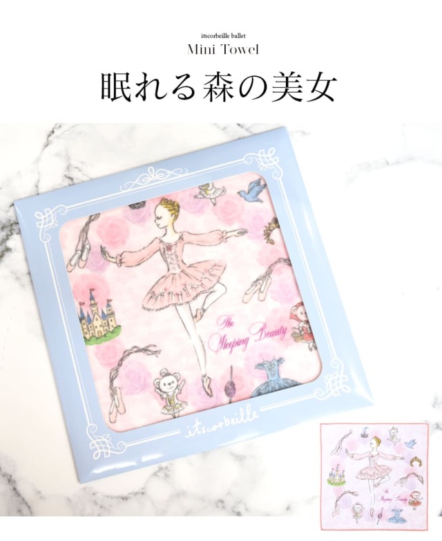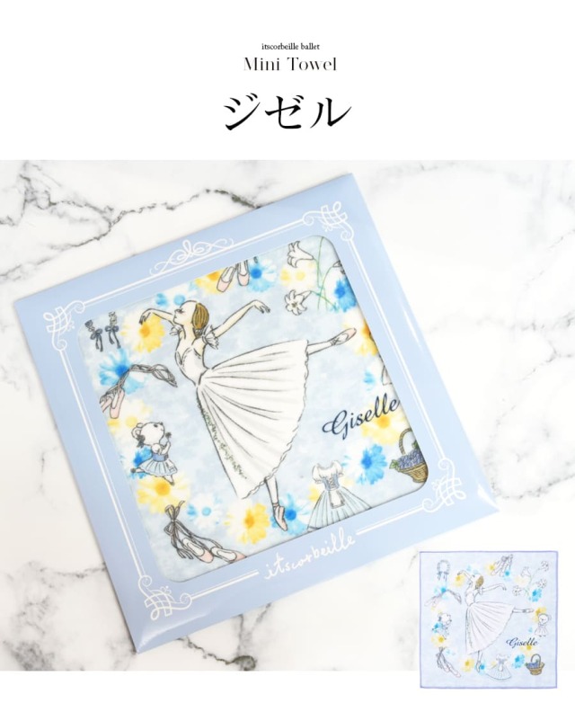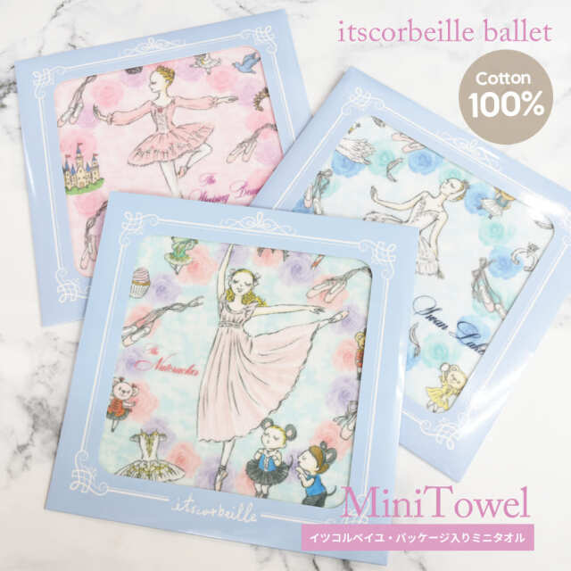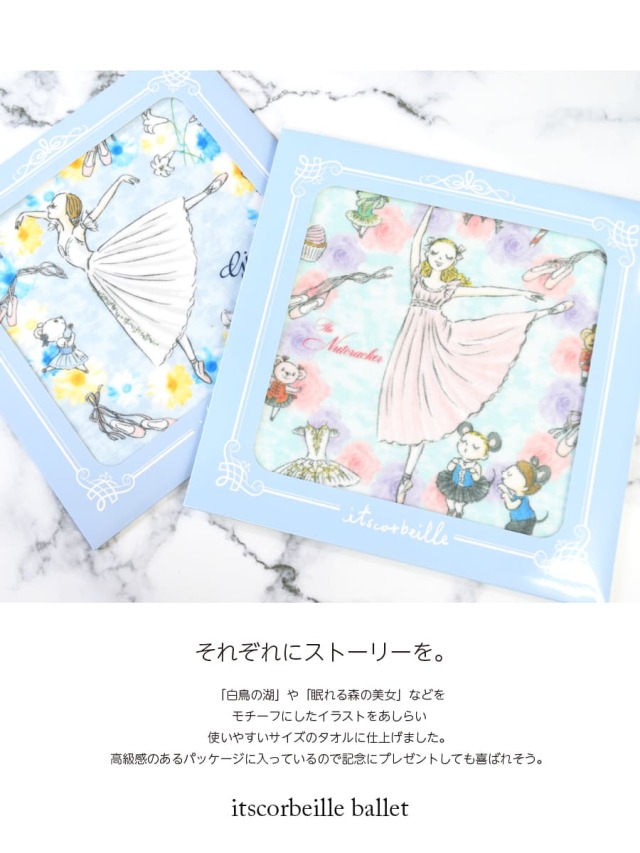 バレエの演目を愛らしいイラストにした「itscorbeille ballet」のパッケージ入りのミニスタオルです。