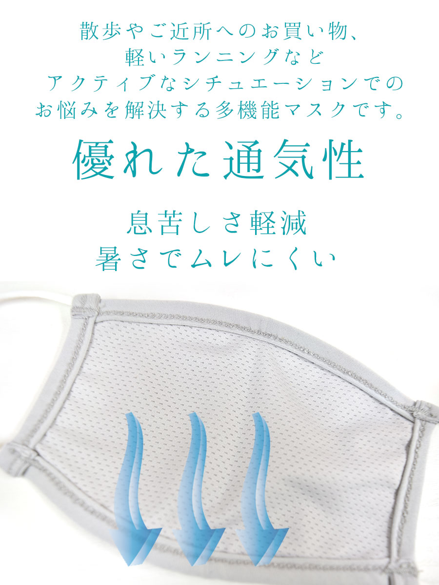 暑い日でも熱がこもらず、ひんやり快適夏の機能性マスクランニングやアクティブな運動に!暑くなる季節にも◎肌が触れた時、ひんやり冷たさを感じます。着けるだけで簡単UV対策OK!呼吸も楽ラク吸水速乾だからベタつかず早く乾き運動時にもおすすめです。